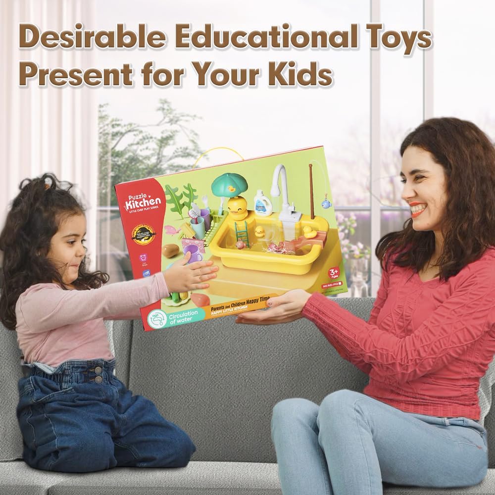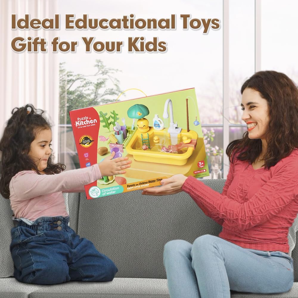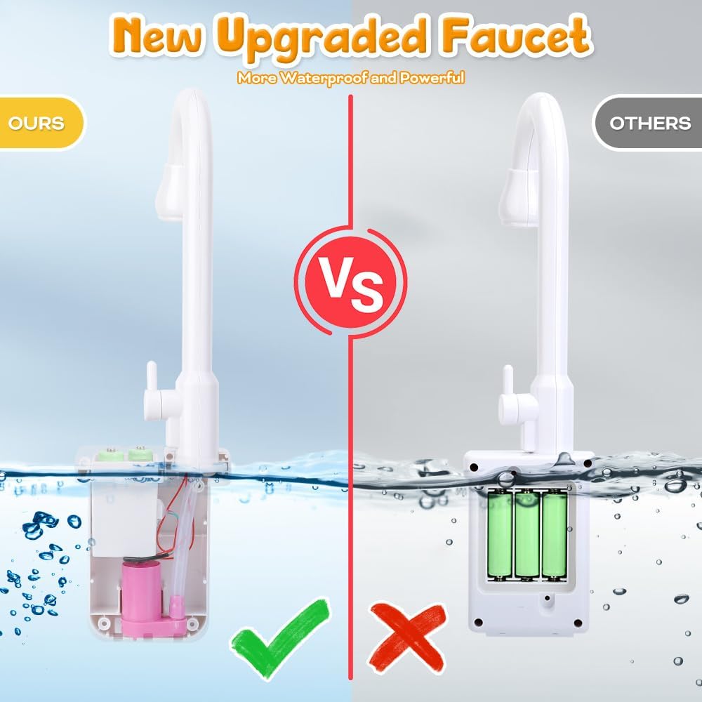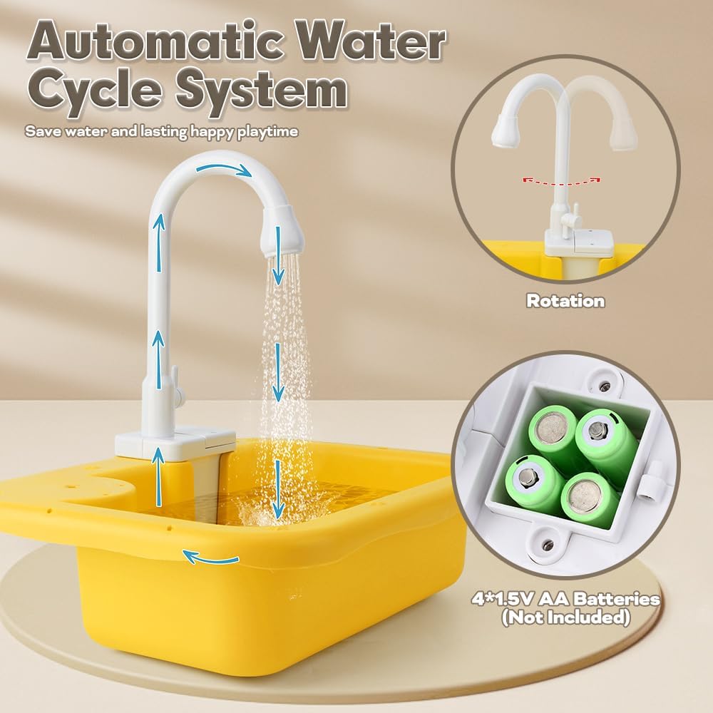 • نظام دورة المياه التلقائي: قم بتشغيل الصنبور الدوار، وستخرج المياه الجارية من الصنبور الكهربائي المطور وتعود إلى لعبة حوض المياه. نظام تدوير المياه الأوتوماتيكي سيوفر الماء ويجلب للأطفال متعة لا نهاية لها. يعمل على 4 بطاريات AA (غير متضمنة).