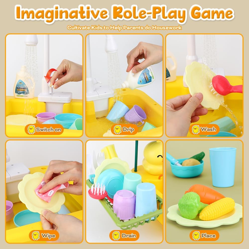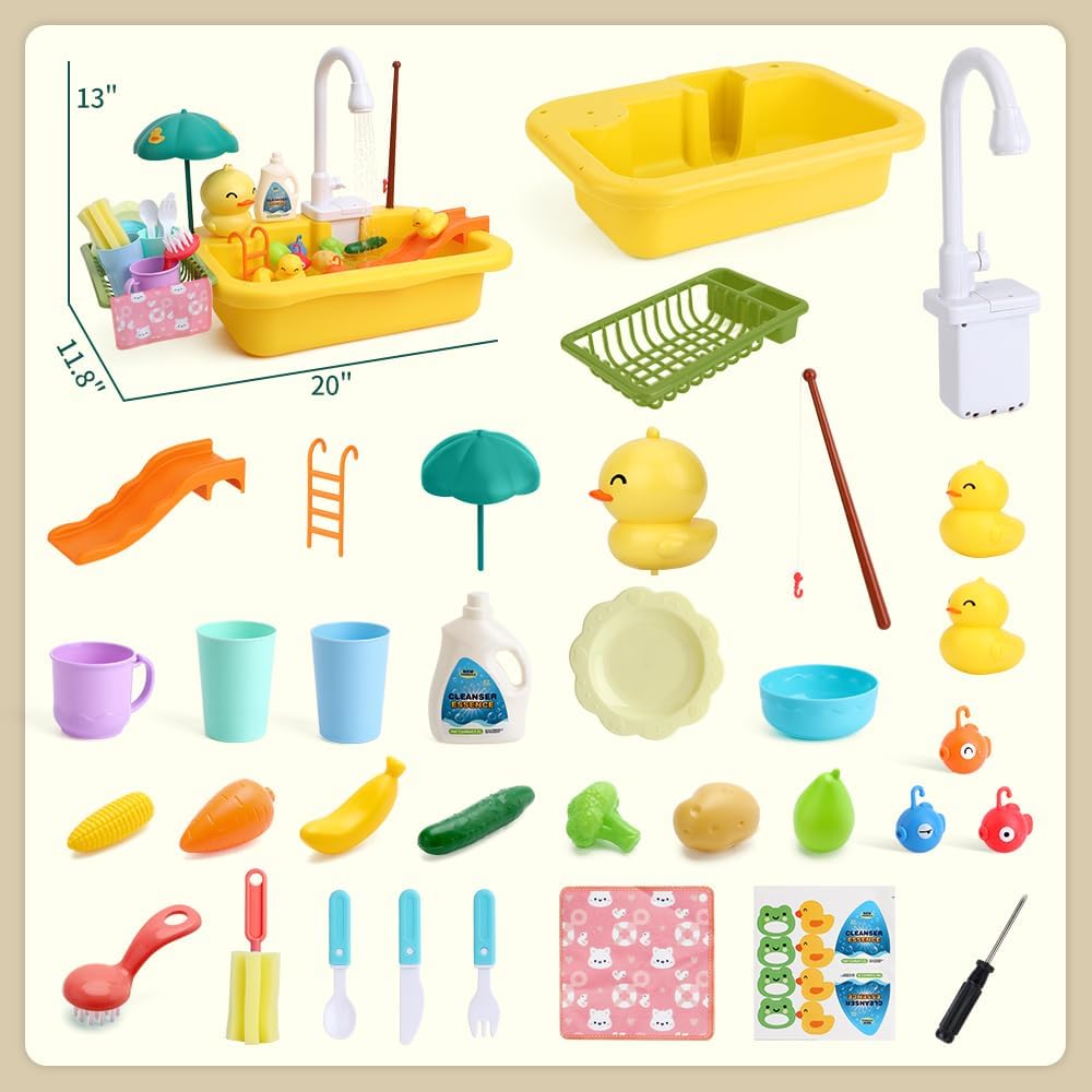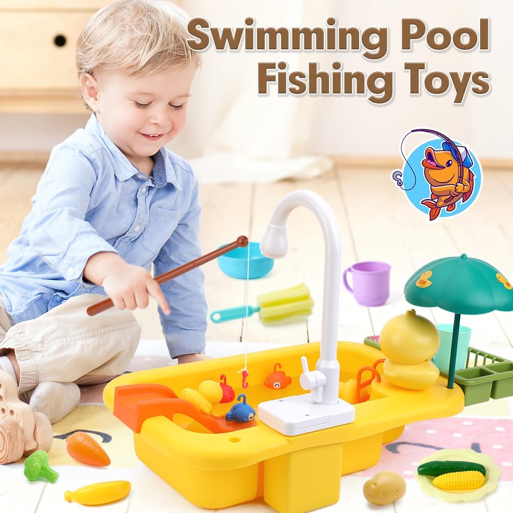 sinomars تلعب بالوعة مع المياه الجارية، لعبة بالوعة طفل صغير مع نظام دورة المياه التلقائي، لعبة الصيد، رف الأطباق واللعب الطعام، التظاهر اللعب بالوعة المطبخ لعبة غسالة الصحون للبنين بنات الأطفال الصغار 1-3