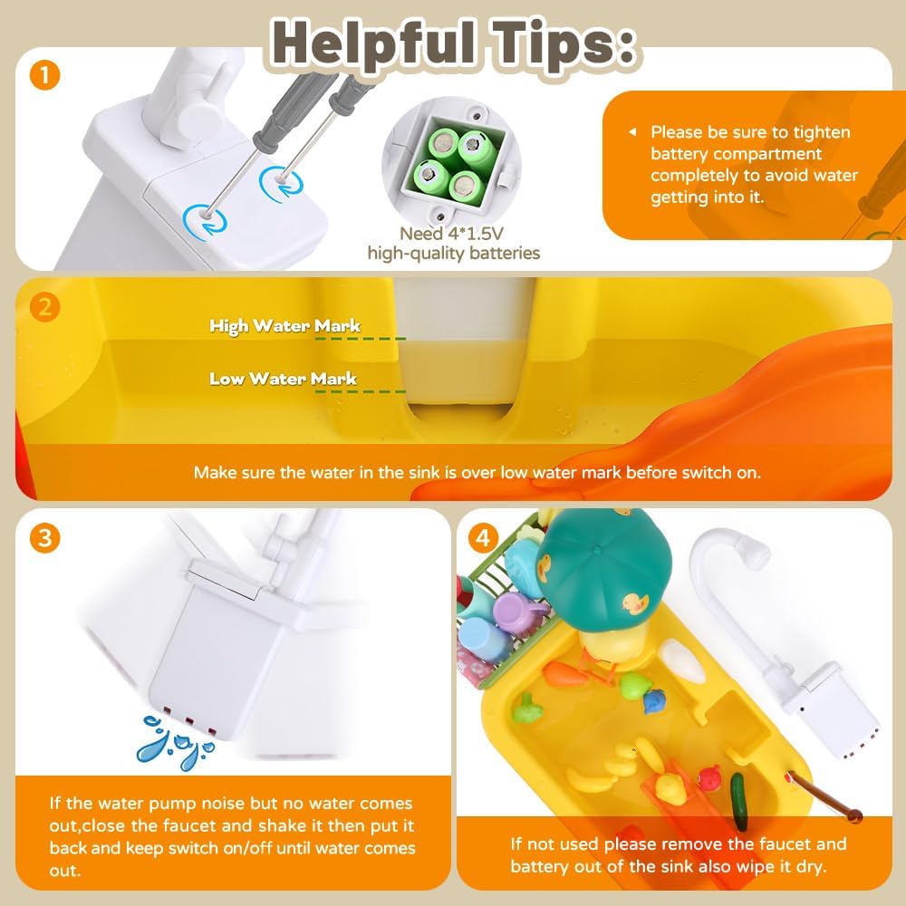 • نصائح مفيدة: 1. قم بإزالة البطاريات والصنبور في حالة عدم استخدامه. 2. إذا كان الصنبور يعمل ولكن الماء لم يخرج خلال 2-3 دقائق بعد استبدال البطارية الجديدة، فيرجى التخلص من أي ماء محصور من الصنبور وتشغيل/إيقاف التشغيل حتى خروج الماء. في حالة وجود أي قلق آخر بشأن حوض مطبخ الأطفال، فلا تتردد في الاتصال بنا.