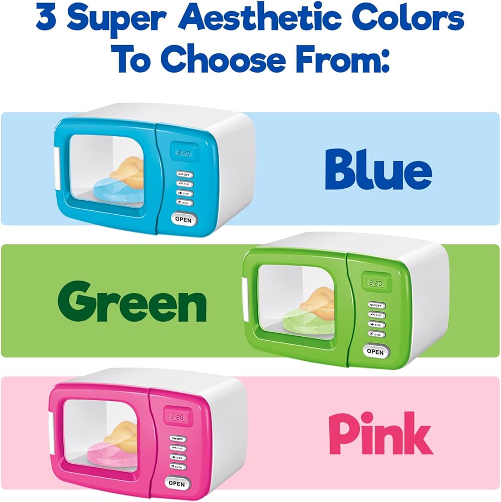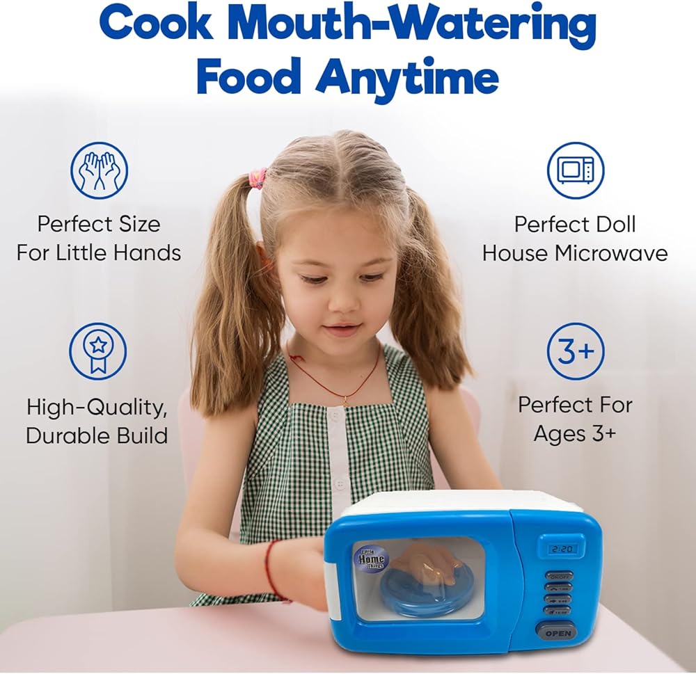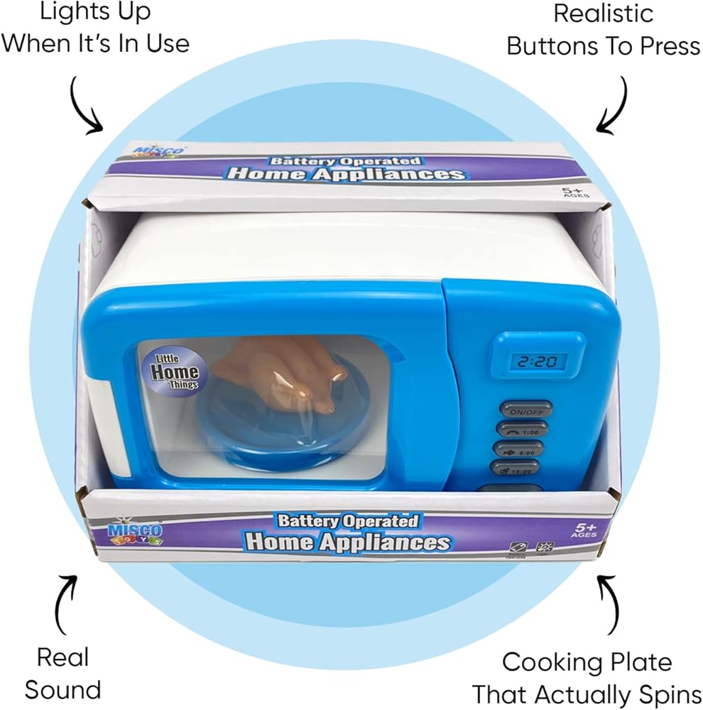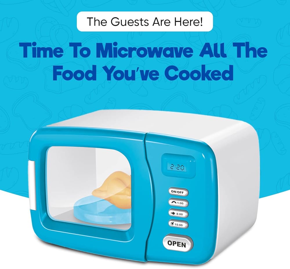 REALISTIC TOY MICROWAVE - Features realistic buttons to press, real sounds, a cooking plate that actually spins, and a light that lights up when the mini microwave oven toy is in use.