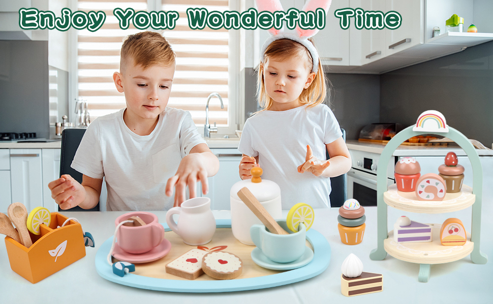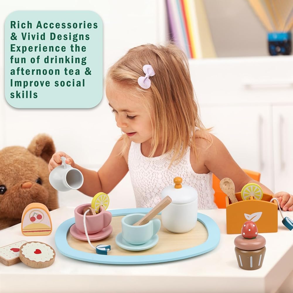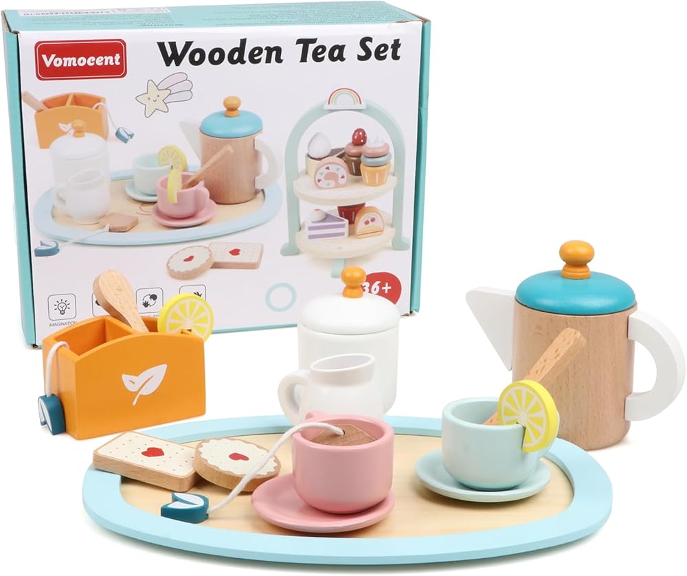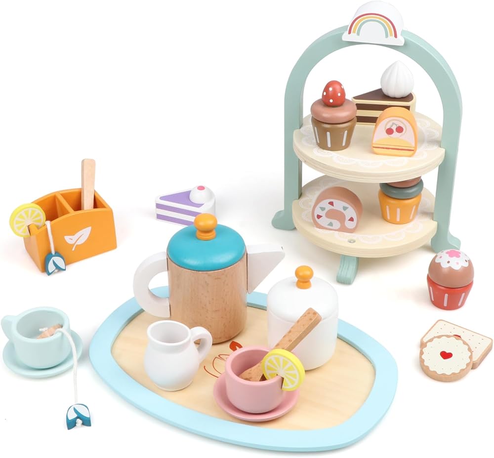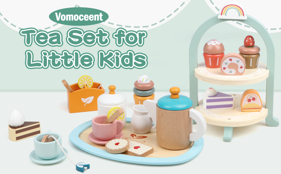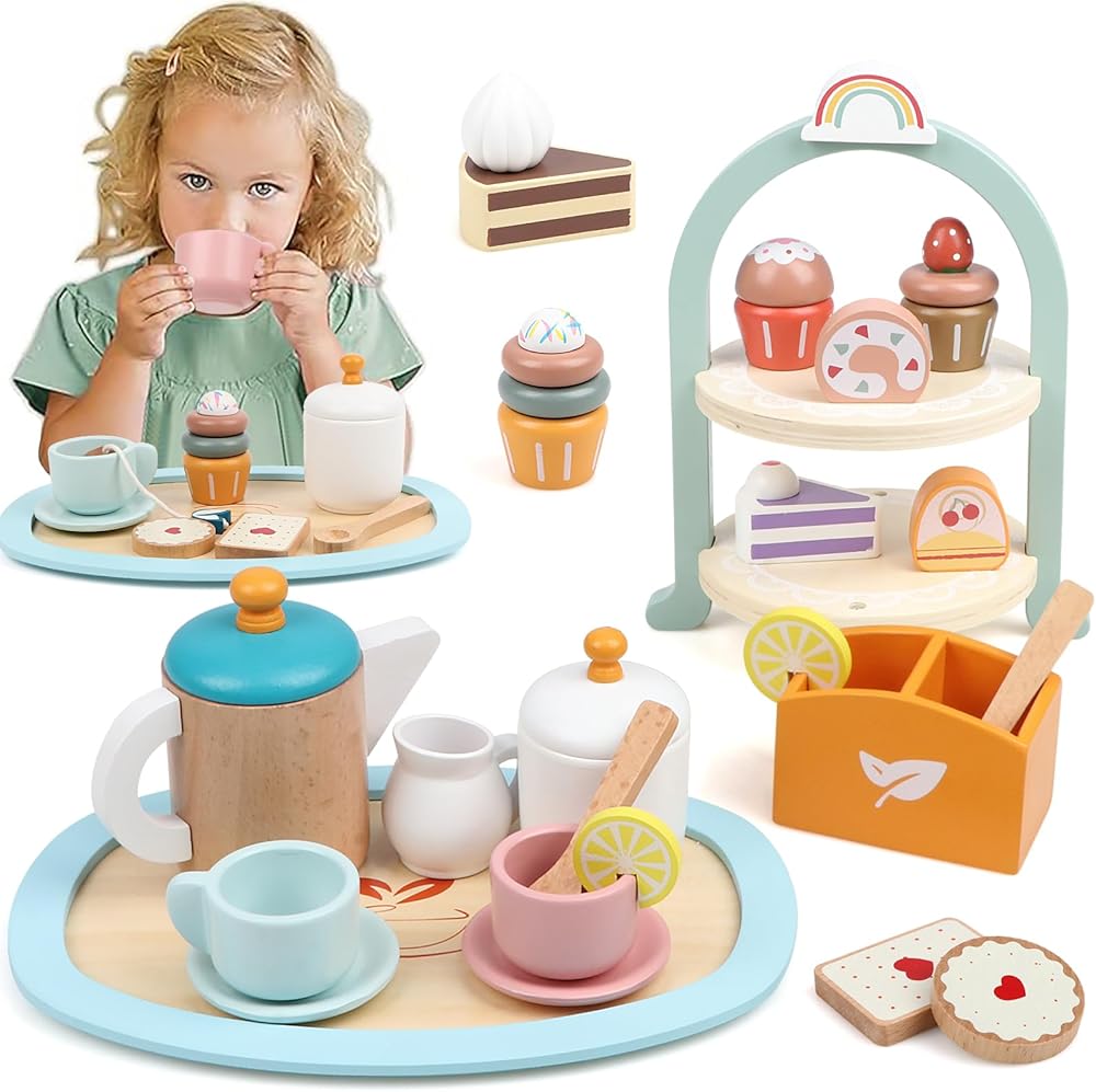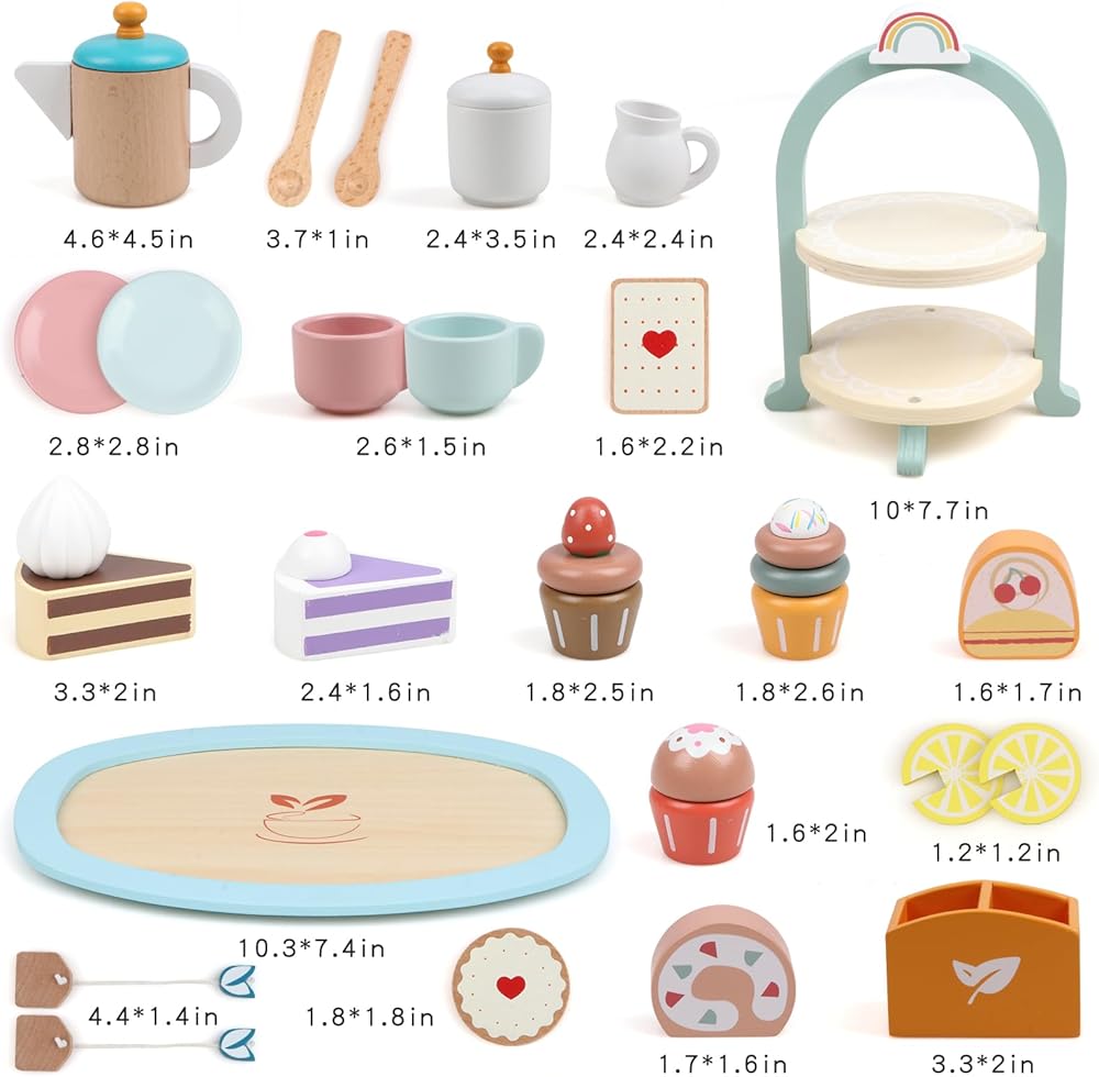 مجموعة فوموسنت 29 قطعة لحفلات الشاي الخشبية للفتيات الصغيرات، طقم شاي مع حامل كب كيك وإكسسوارات لعب التظاهر بالطعام للأطفال، ألعاب مجموعة ألعاب المطبخ لعمر 3 سنوات فما فوق هدية عيد ميلاد للأولاد والبنات