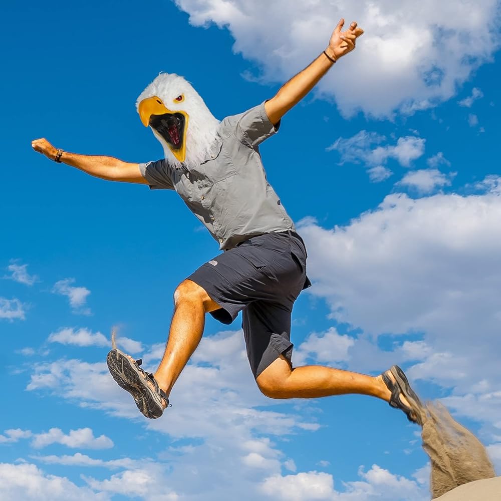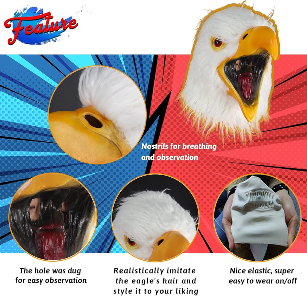 • ★ المادة: قناع رأس النسر مصنوع من اللاتكس الطبيعي الآمن بنسبة 100%، لا يبهت ويدوم طويلاً، وقد تم معالجة إزالة الروائح الكريهة في عملية الإنتاج. غير سام، عازل مقاوم للماء، قابل للتمدد بشكل جيد. ملحوظة: يناسب عمر 13 سنة فما فوق.