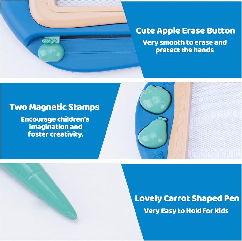 سهلة المسح: لوحة الرسم الخاصة بنا مجهزة بوظيفة مسح يدوية، مما يجعل مسح جميع الرسومات المبتكرة سهلاً وسريعًا بشريحة واحدة. على عكس تقنيات الرسم الورقية التقليدية، فإن لوحة الرسم الخاصة بنا تزيل المخاوف بشأن تلطيخ ملابس الأطفال وجدرانهم، مما يوفر بيئة رسم أصلية أكثر نظافة وأمانًا.