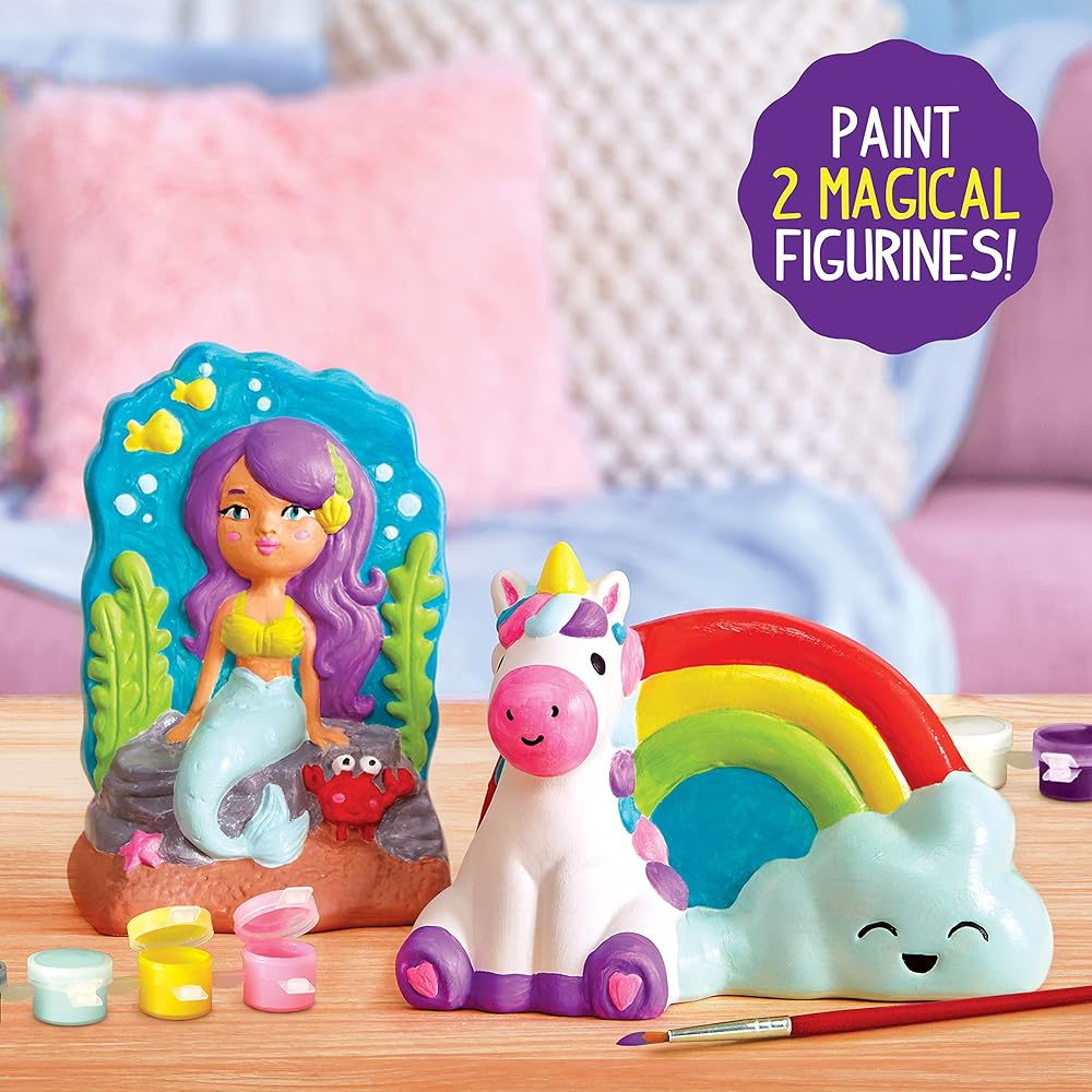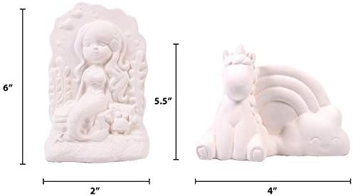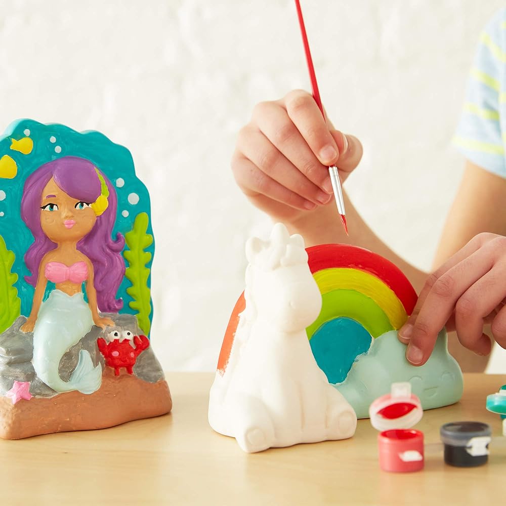 تتضمن المجموعة: 2 مجسم من السيراميك، 10 ألوان طلاء، 1 فرشاة طلاء، تعليمات سهلة الاتباع