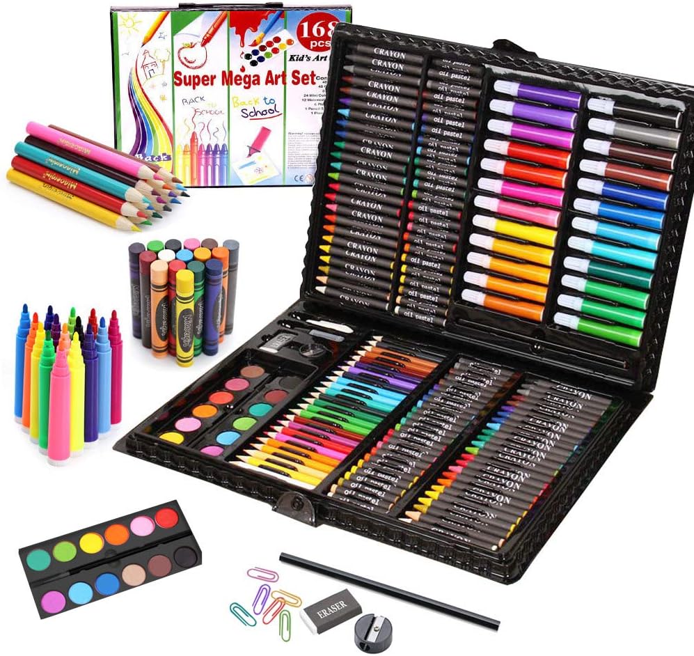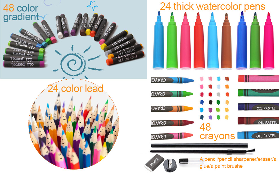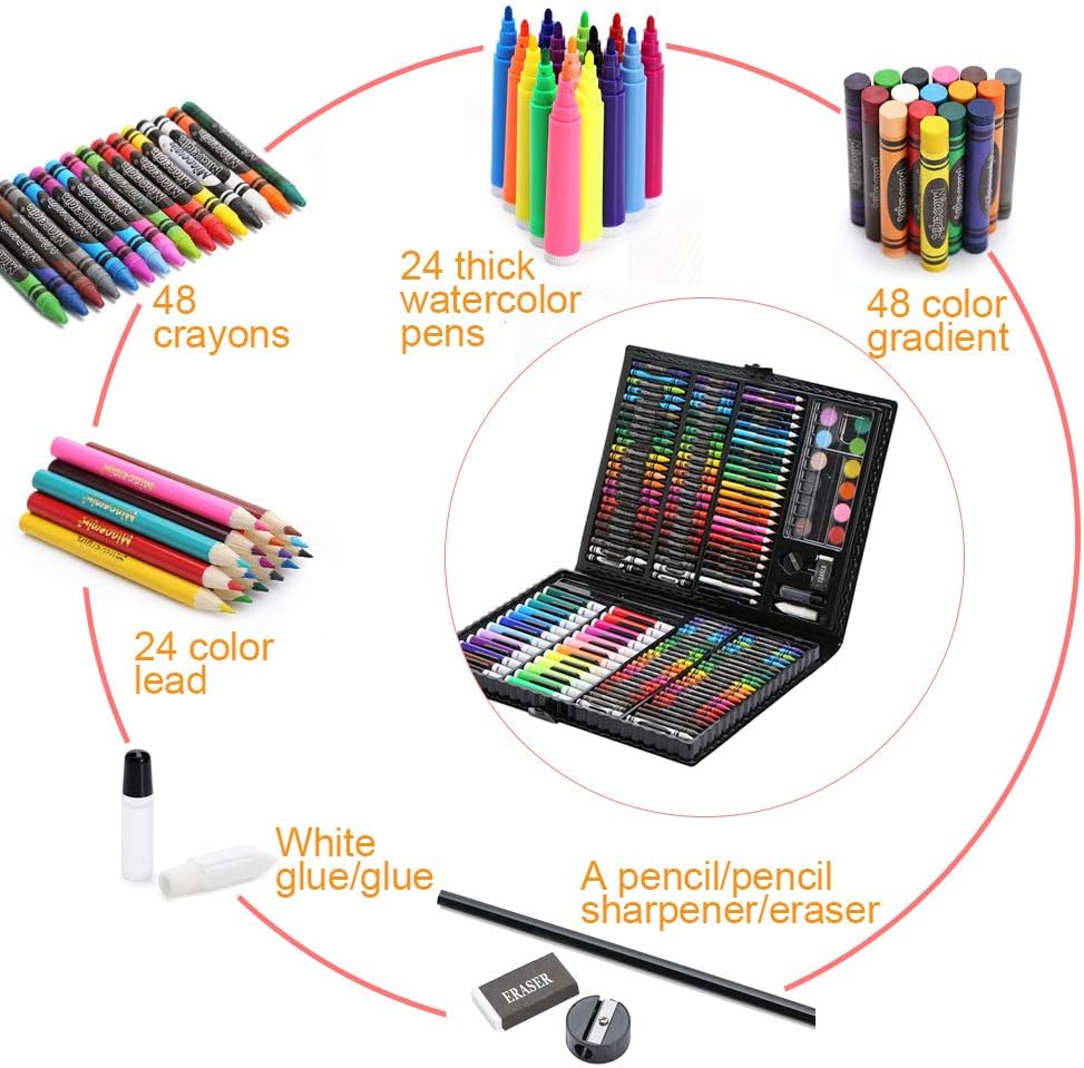 مجموعة رسم مكونة من 168 قطعة تشمل: 48 لون باستيل زيتي (24 لونًا مختلفًا)، 48 قلم تلوين (24 لونًا مختلفًا)، 24 قلم ملون، 24 قلم مائي، 12 كعكة ألوان مائية، 6 مشبك ورق، 1 قلم رسم، 1 مبراة أقلام، 1 ممحاة واحدة، حقيبة بلاستيكية محمولة 1 صمغ.