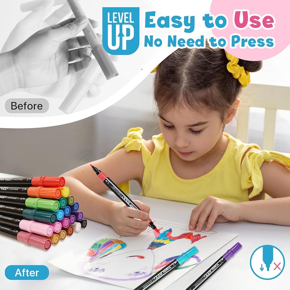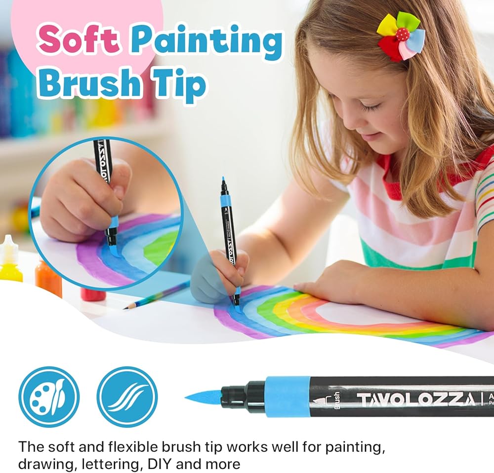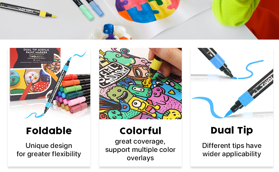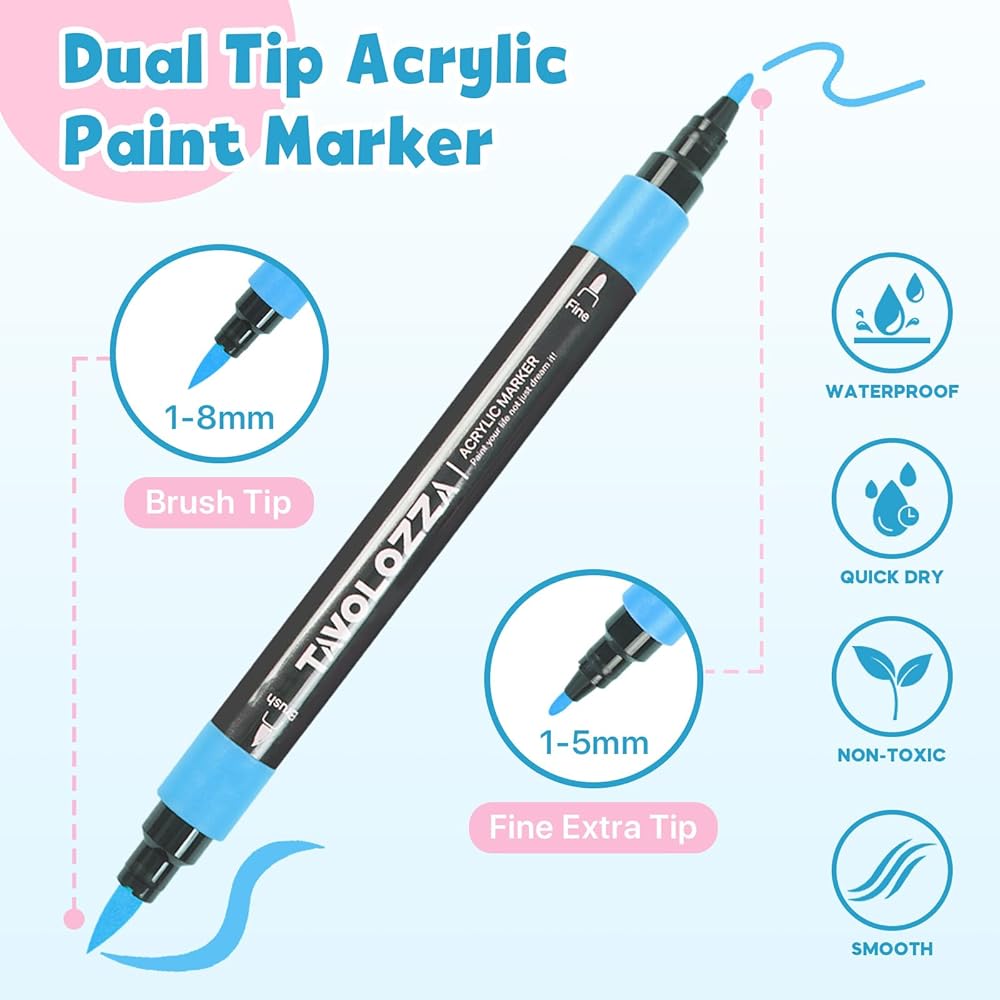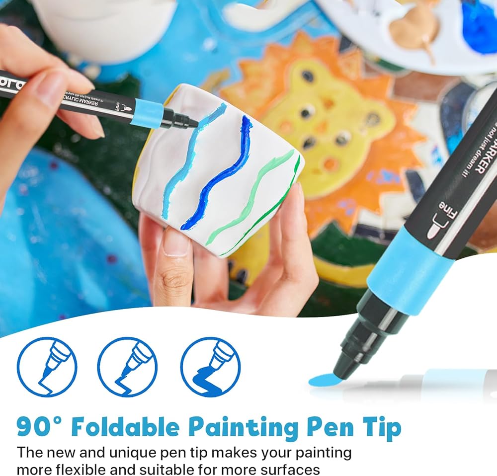 أقلام طلاء أكريليك ذات رأس مزدوج: يحتوي كل قلم أكريليك على رأس فرشاة ورأس ناعم قابل للطي، مع طرف فرشاة لإنشاء ضربات متوسطة أو جريئة، ورأس رفيع للرسم التفصيلي.