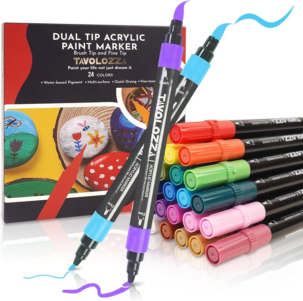 أقلام طلاء أكريليك TAVOLOZZA 24 لونًا، علامات طلاء ذات طرف مزدوج مع طرف فرشاة وعلامات مقاومة للماء ذات طرف رفيع قابلة للطي مثالية للصخور والقماش والخشب والنسيج والزجاج (ترقية)