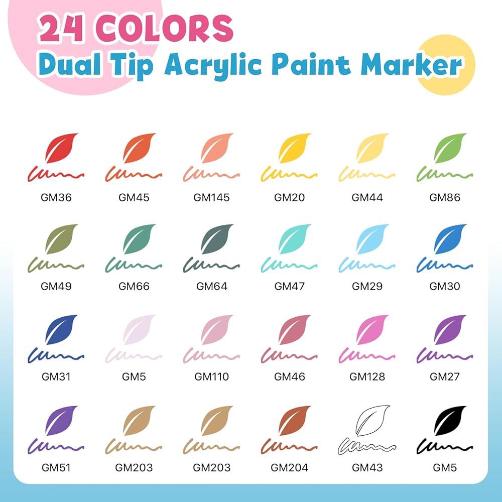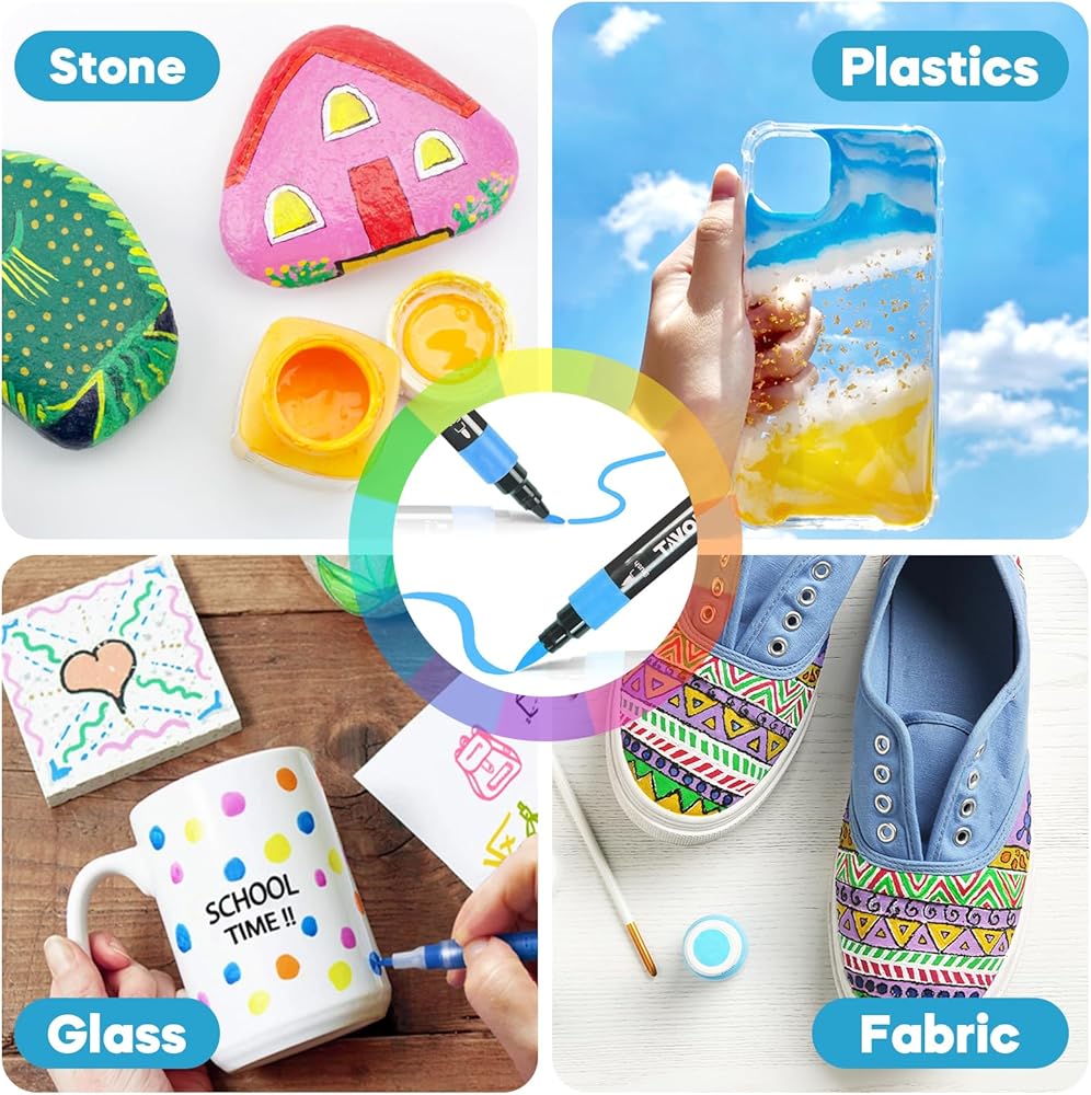 تعمل على أسطح متعددة: تتميز هذه المجموعة من أقلام الطلاء الأكريليك ذات الطرف المزدوج بمجموعة واسعة من الألوان لإضفاء الحيوية على أعمالك الفنية على الأسطح المختلفة بما في ذلك القماش والخشب والصخور والنسيج والزجاج.