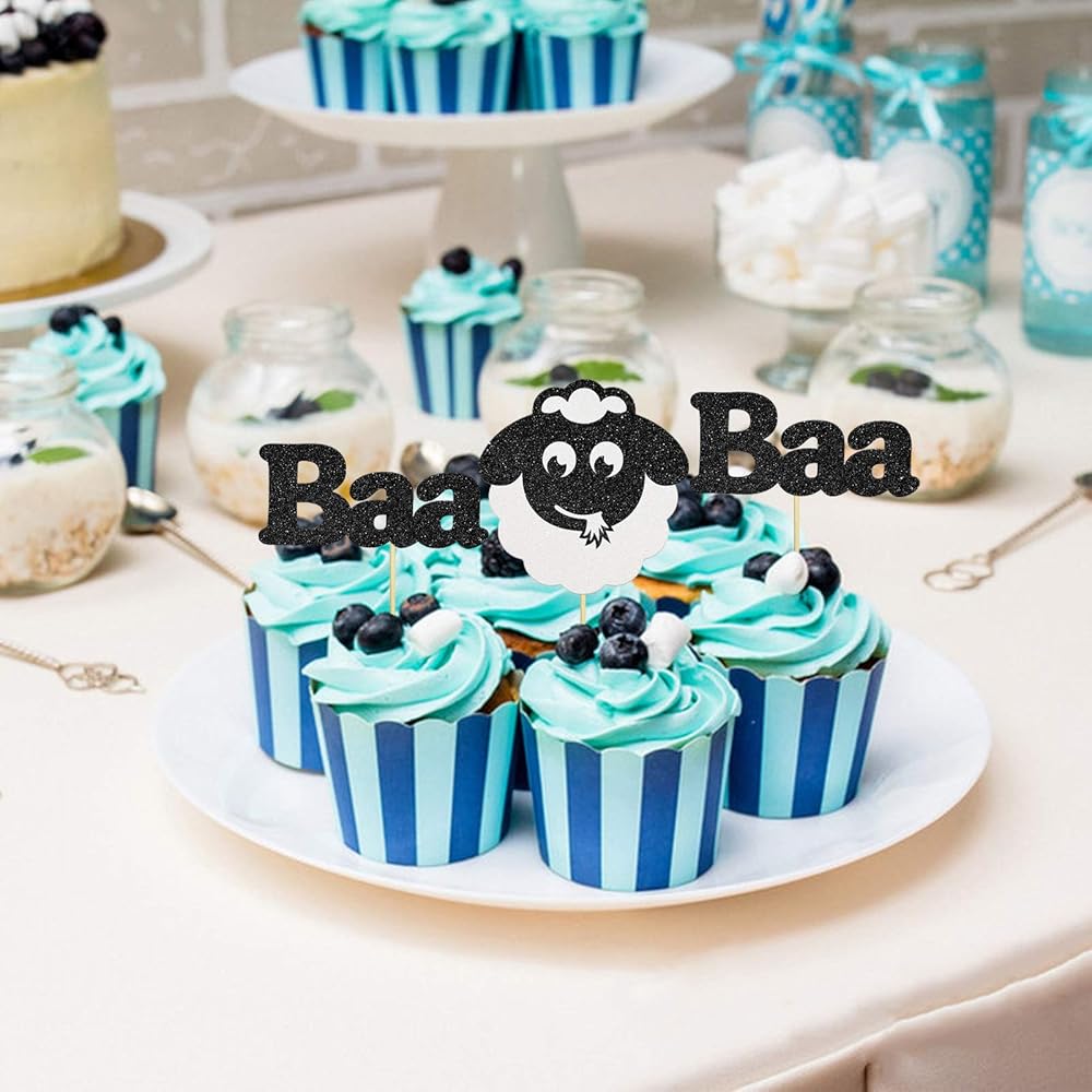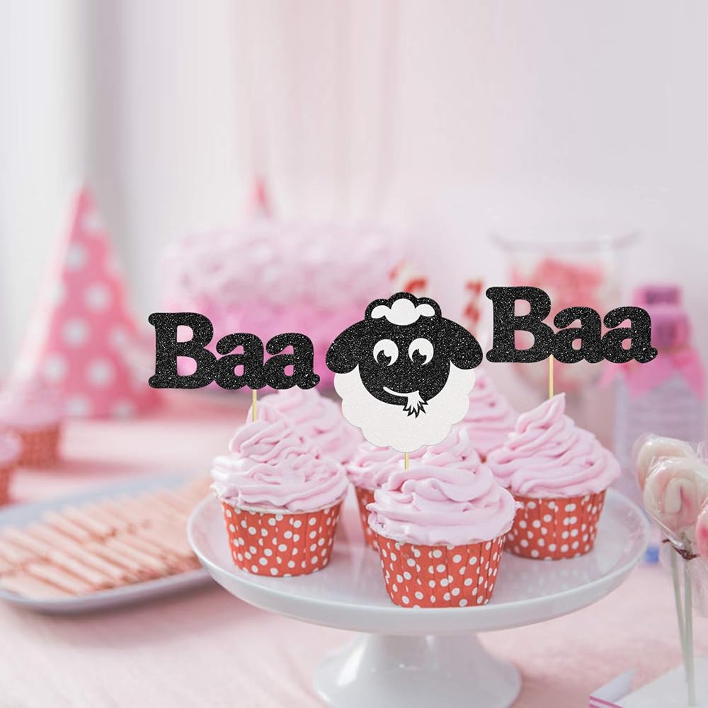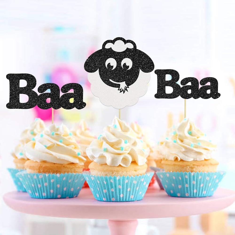 24 قطعة من أغطية الكب كيك على شكل خروف أسود لامع لحفلات استقبال المولود، ديكور كعكة عيد ميلاد سعيد، تصميم حيوانات، مستلزمات تزيين حفلات عيد ميلاد الأطفال