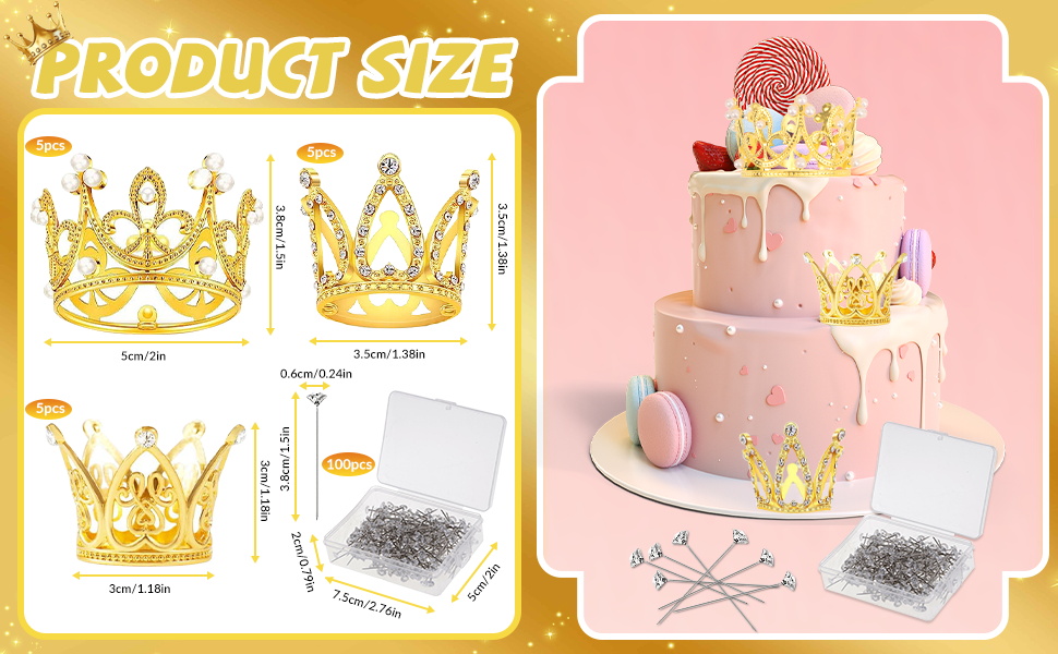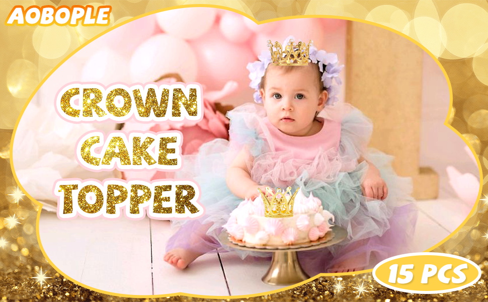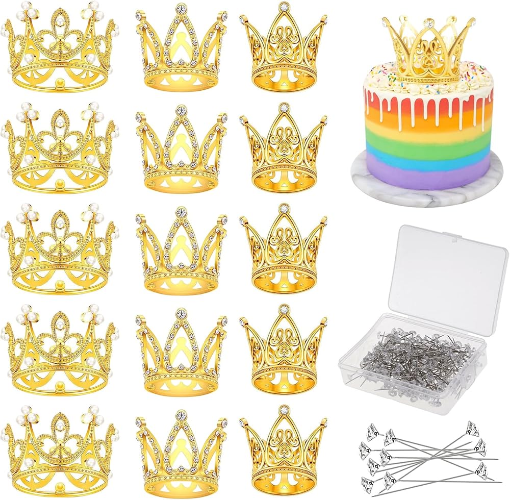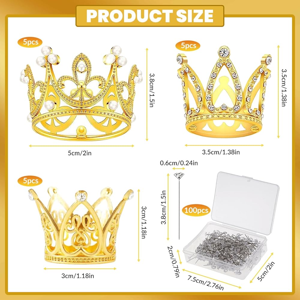 AOBOPLE 15 قطعة من أعلى الكعكة على شكل تاج ذهبي مع 100 قطعة من دبابيس باقة الزفاف، تزيين كعكة عيد ميلاد الطفل لأعياد الميلاد وحفلات الزفاف والحفلات وديكور حمام الطفل (3 أنماط)