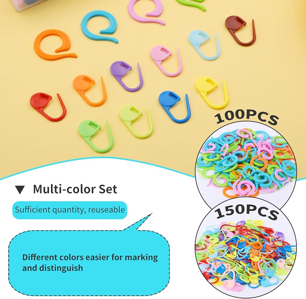 مجموعة كاملة من 250 قطعة: صندوق تخزين بمساحة تخزين يتسع لـ 150 قطعة من علامات الغرز البلاستيكية (لون عشوائي) و100 قطعة من حلقات الحياكة (لون عشوائي) بقطر 0.87 انش. يمكن تنظيم جميع أقلام التحديد في صندوق التخزين هذا لسهولة التخزين والحمل.