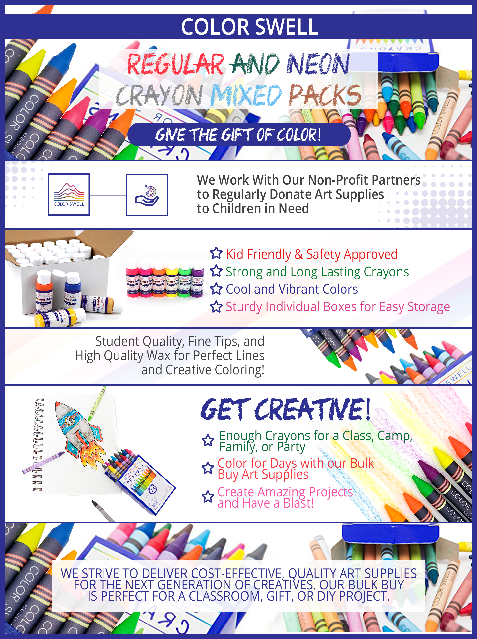 SATISFACTION GUARANTEE FOR CRAYONS, WITH A CAUSE! We love our crayons and we want you to love them too. If it doesn't work out for you, send us an email and we will refund or replace your purchase. The Color Swell mission is to donate art supplies to kids in need for every product sold, we couldn't do this without PHENOMENAL CUSTOMER SERVICE