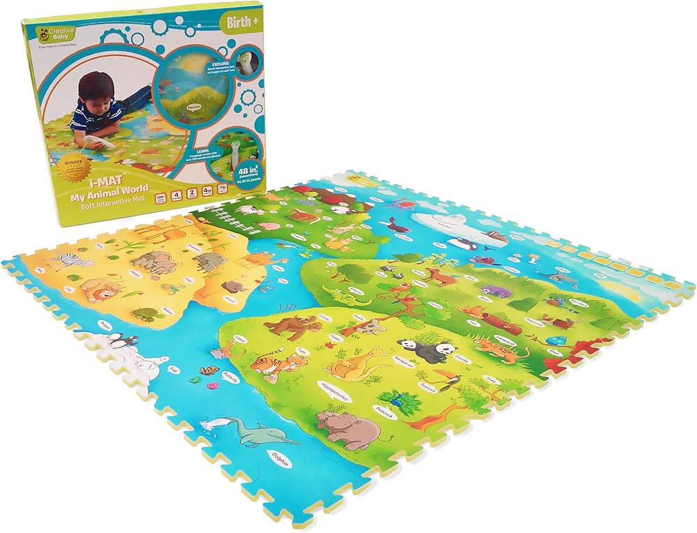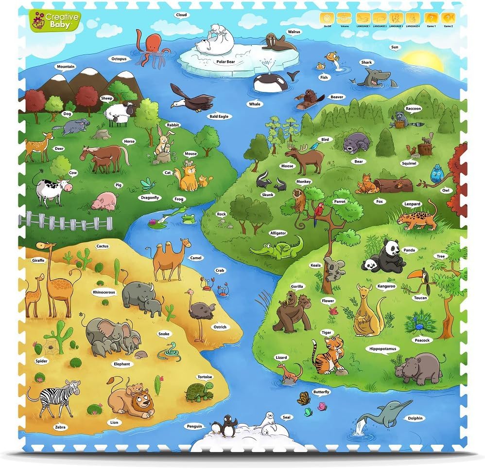 يحتوي Creative Baby i-Mat My Animal World على رسوم توضيحية كاملة لأكثر من 50 حيوانًا ليتعلمها الأطفال. وبصرف النظر عن 4 لغات (الإنجليزية والإسبانية والصينية والفرنسية الكندية)، فإن ميزة الألعاب التفاعلية الموجودة على السجادة تسمح للأطفال بالتعلم بطريقة مثيرة للاهتمام ومختلفة. سوف يتعلم أطفالك الصغار الحيوانات والأشكال والأرقام والألوان بأربع لغات مختلفة. قم بتوجيه القلم الصوتي إلى الأشياء الموجودة على i-Mat واستمع إلى جميع الحيوانات المختلفة والموسيقى والأصوات الممتعة.