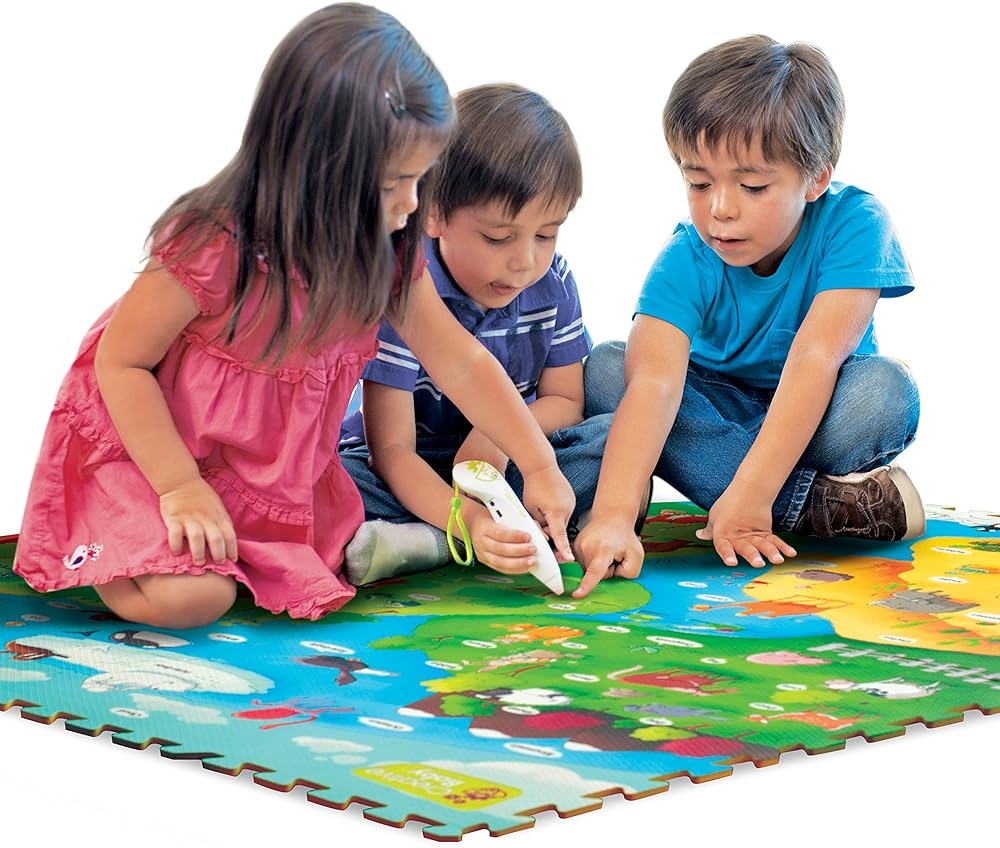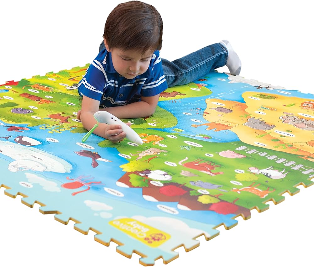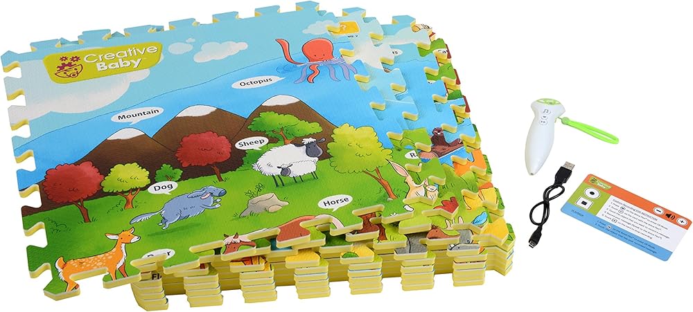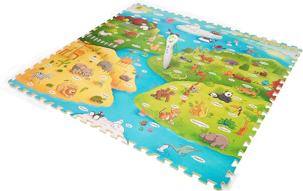 Components: 9 pieces (16.5 inches x 16.5 inches each) of soft play mats (48 inches x 48 inches after assembled) made of soft durable material with colorful illustrations of objects from the animal world, 1 voice pen