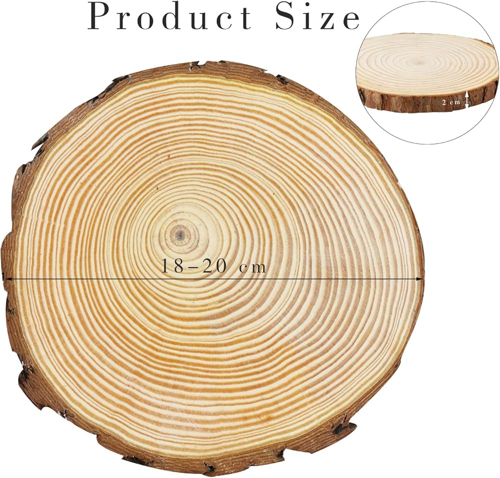 حجم شريحة الخشب: مصنوعة من الصنوبر الطبيعي مع اللحاء، لذلك تختلف المقاسات، بمتوسط قطر 7-8 انش وسمك حوالي 2 سم/0.8 انش، قوي جدًا.