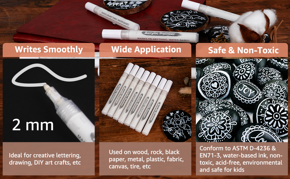🎨 【جودة وأمان ممتازان】يتوافق مع ASTM D-4236 وEN71-3. أقلام تحديد الطلاء الأكريليك هذه مصنوعة من طلاء أكريليك مصبوغ بدرجة عالية. تجف أقلام الأكريليك البيضاء بسرعة لإنتاج لمسة نهائية غير شفافة ولامعة للغاية على الأسطح الفاتحة والداكنة. قلم الطلاء الأبيض غير سام ومقاوم للماء والأشعة فوق البنفسجية. رائعة للاستخدام الداخلي والخارجي. إنها مثالية لتزيين وتلوين القرع في عيد الهالوين