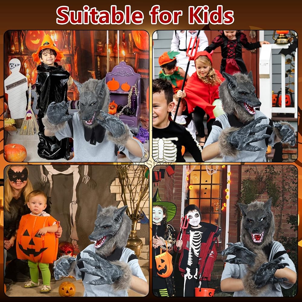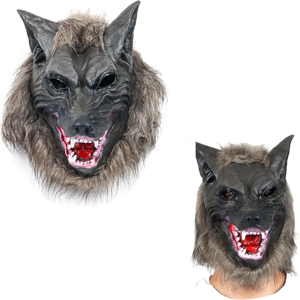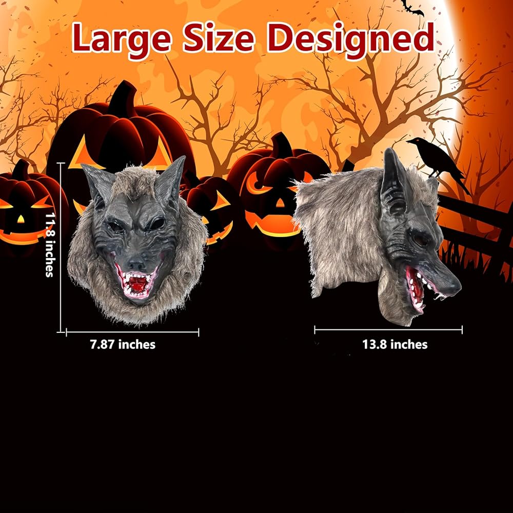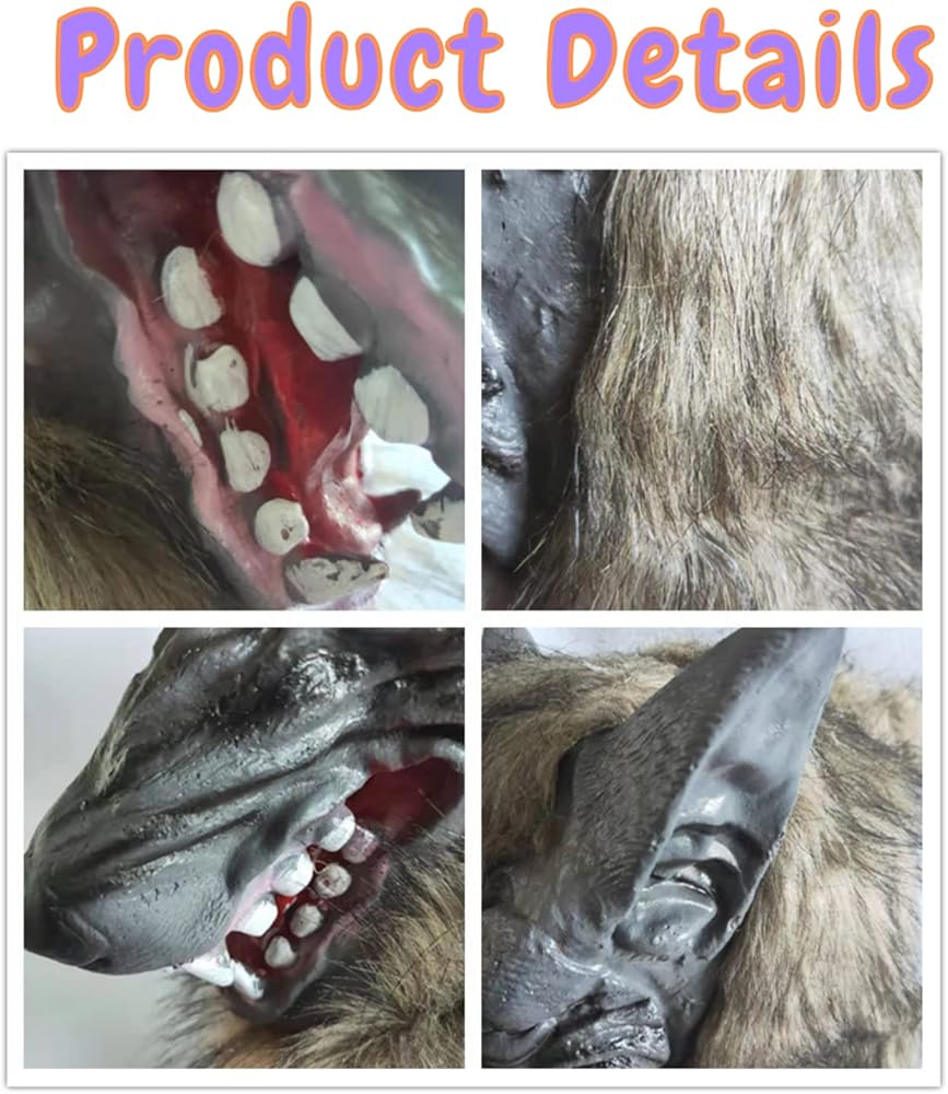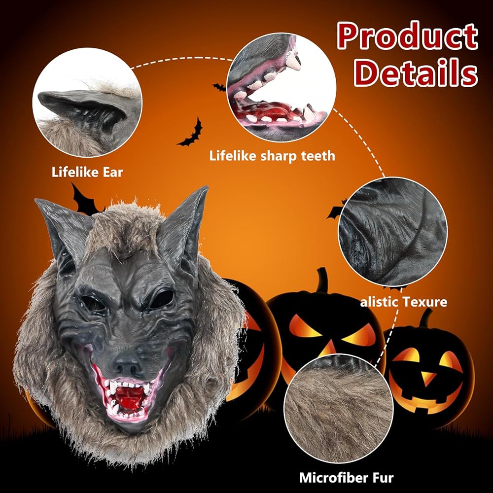 مظهر حقيقي لا يمكن تصوره: رأس ذئب منافس آخر، نحن أكثر سمكًا وغير قابل للتشوه، نسيج لاتكس يقلد أسنان الذئب الحادة، فراء من الألياف الدقيقة النابضة بالحياة. لا يمكنك الانتظار لإخافة المزيد من الأشخاص