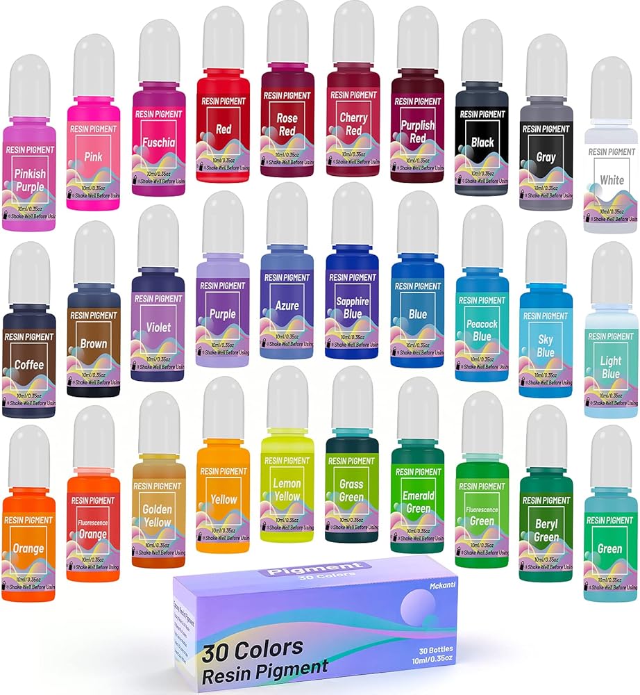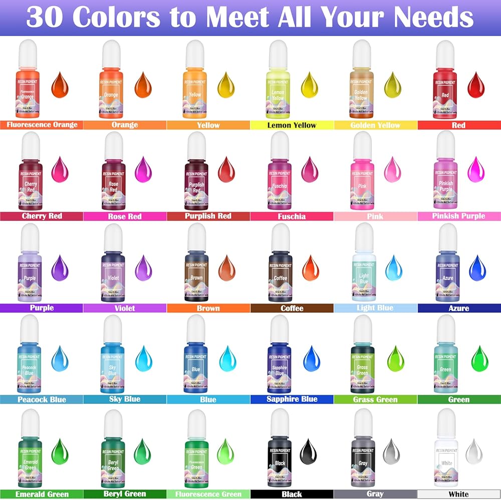 🌈【30 لونًا رائعًا ونابضًا بالحياة】 سوف تحصل على 30 زجاجة من صبغات راتنج الإيبوكسي الشفافة بألوان مختلفة. تتضمن مجموعة صبغات الراتنج الخاصة بنا زجاجتين من ألوان الراتنج الفلورسنت: أخضر فلورسنت وبرتقالي فلورسنت؛ كل زجاجة بسعة 10 مل/0.35 اونصة، 30 لونًا زاهيًا لاختيارك، ومجموعة متنوعة من الألوان كافية لتلبية احتياجاتك الإبداعية التي تصنعها بنفسك.