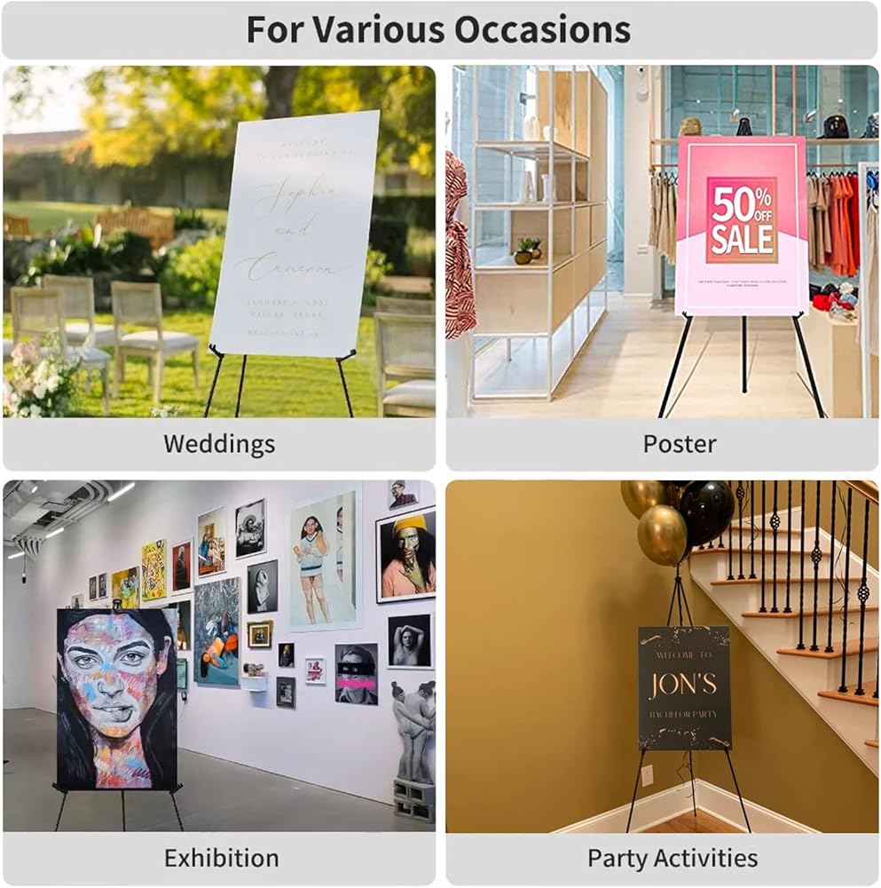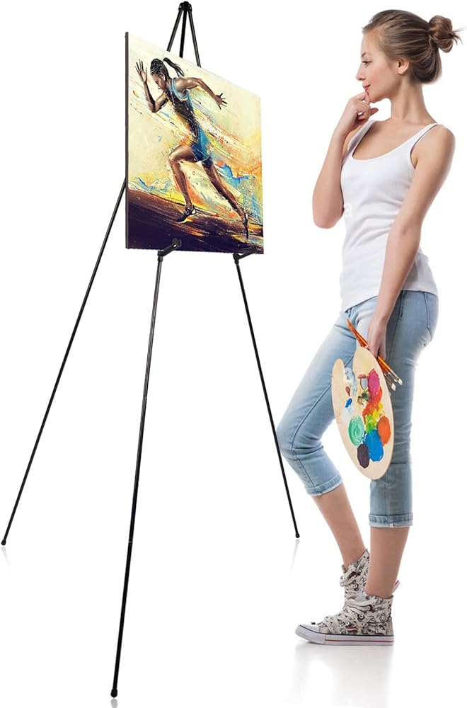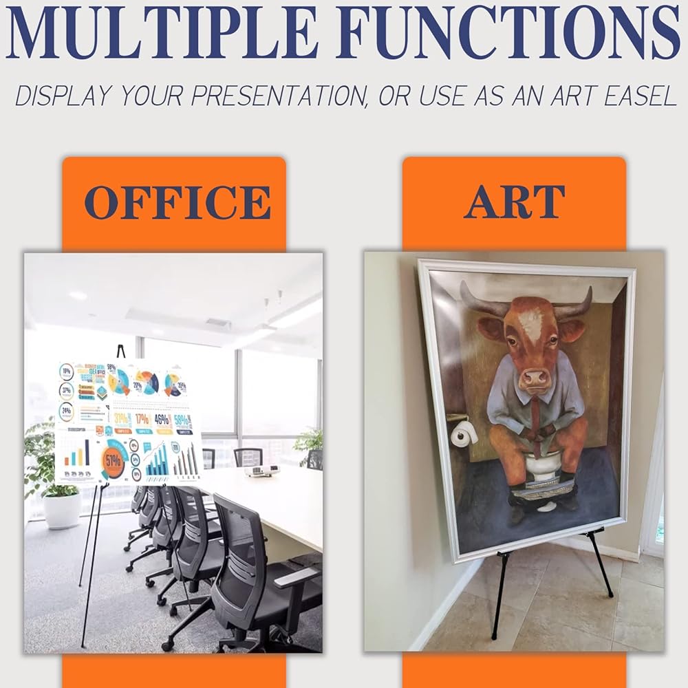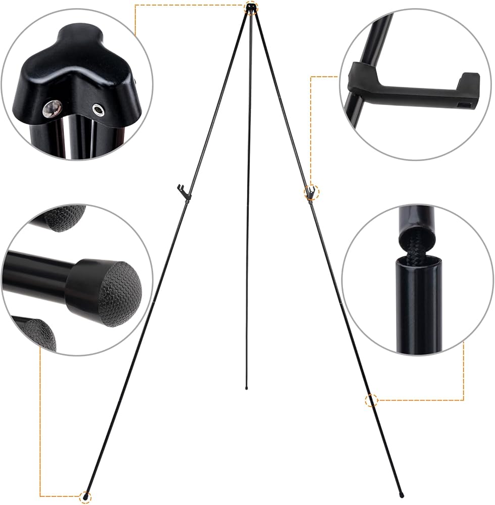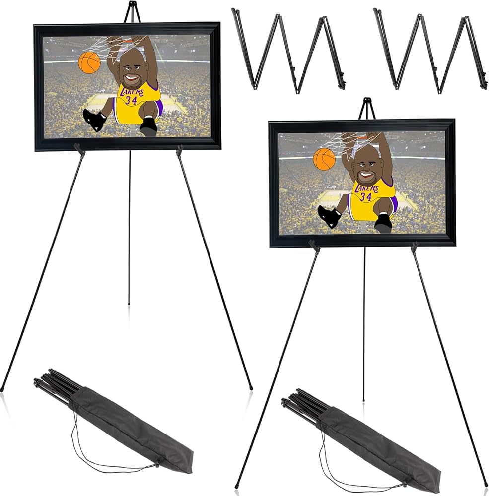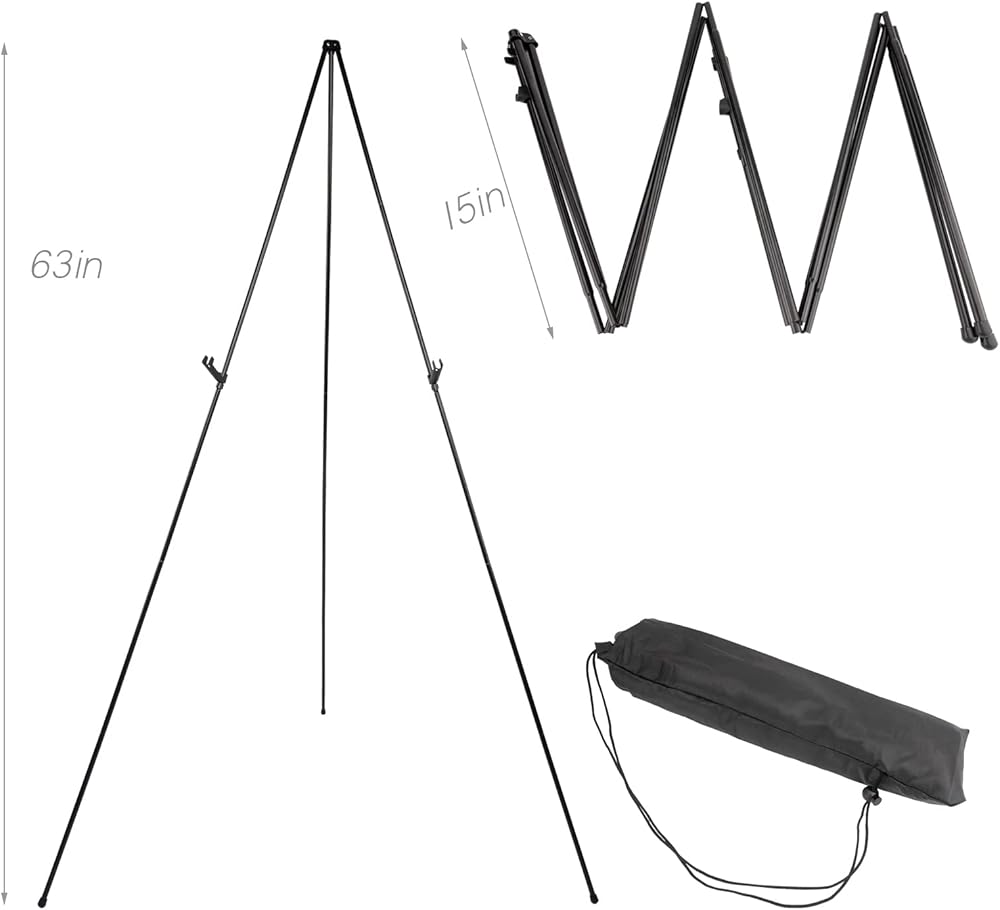 حامل قابل للطي والحمل مثالي للفنانين والمعلمين ومقدمي العروض الذين يحتاجون إلى حل موثوق ومحمول لعرض أعمالهم. خفيفة الوزن وقابلة للطي، مما يجعلها سهلة التخزين والنقل.