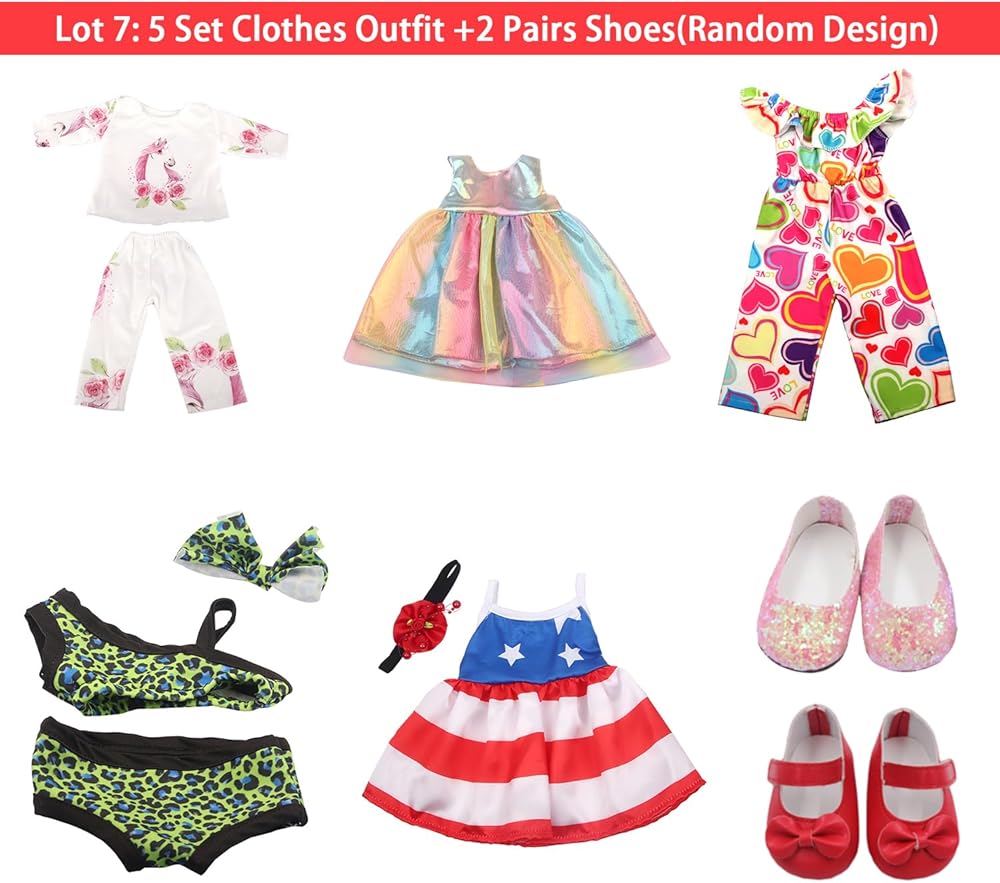 مجموعة ملابس وأحذية الدمى - 5 أنماط مختلفة من ملابس الدمى و2 حذاء باريسي يمكن أن يُظهر للدمية مزاجًا مختلفًا. 3 مجموعات من التنانير، مجموعة واحدة من الملابس، مجموعة واحدة من البيجامات وزوجين من الأحذية يتم إرسالها عشوائيًا. (يُرجى معرفة أن الدمى غير متضمنة). )
