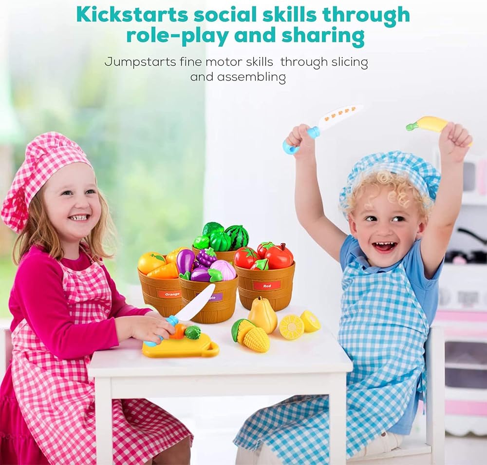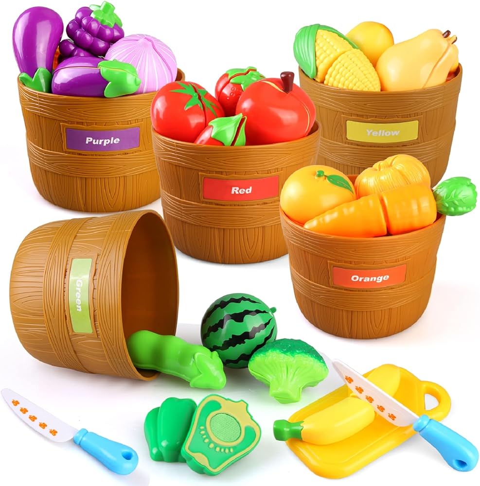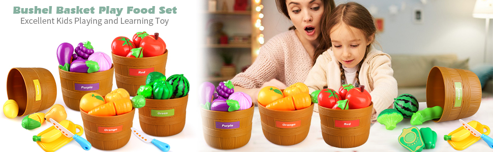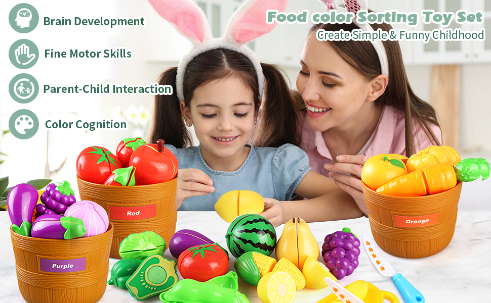 Color Recognition and Sorting - Contains 19 pieces foods in 5 different colors, 5 bushel baskets, 2 toy knives and a cutting board. The food toys accessories can be taken apart and assembled. It will develop color recognition and sorting skills, early math counting ability and motor skills