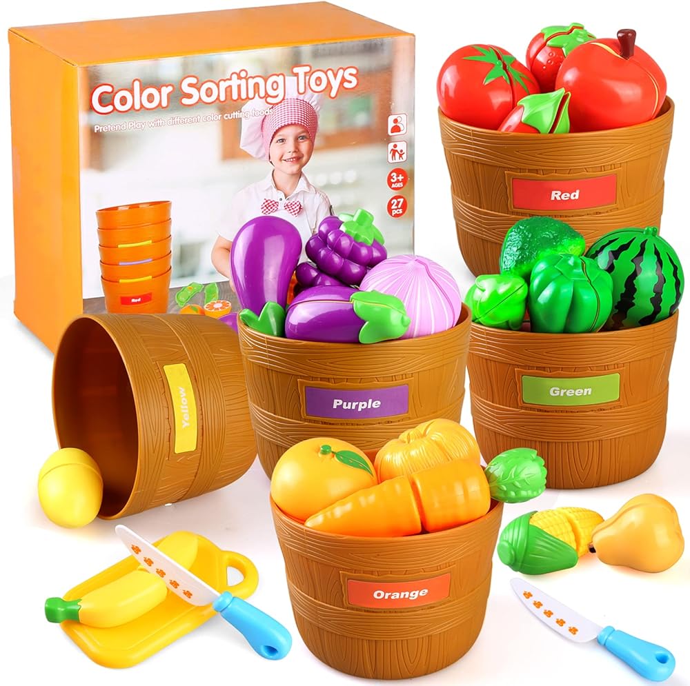 27 قطعة من لعبة تقطيع الطعام للمطبخ، مجموعة ألعاب فرز الألوان، مجموعة طعام تظاهرية للأطفال الصغار، تقطيع الخضروات والفواكه، مجموعة لعب المطبخ مع 5 سلال بوشل وإكسسوارات المطبخ للأطفال من سن 3 سنوات فما فوق