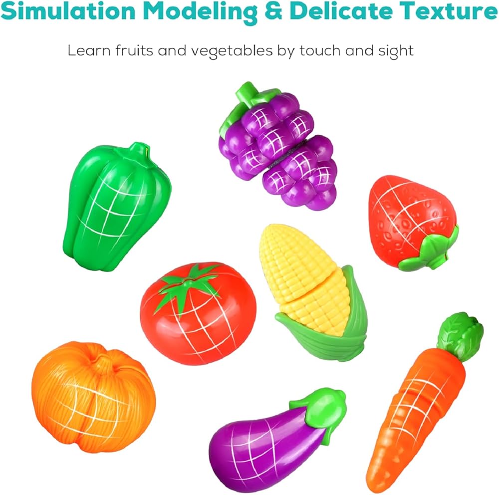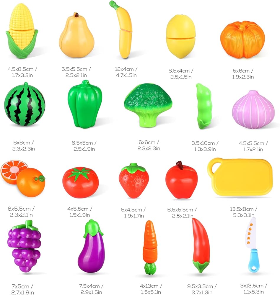 Abundant Accessories - 27 PCS include 19 pieces vegetables and fruits toy accessories, 5 bushel basket, 2 toy knives and 1 cutting board. Children can sort vegetables and fruits, or arrange food in a row and let them count the number, which is very able to exercise their hands-on ability