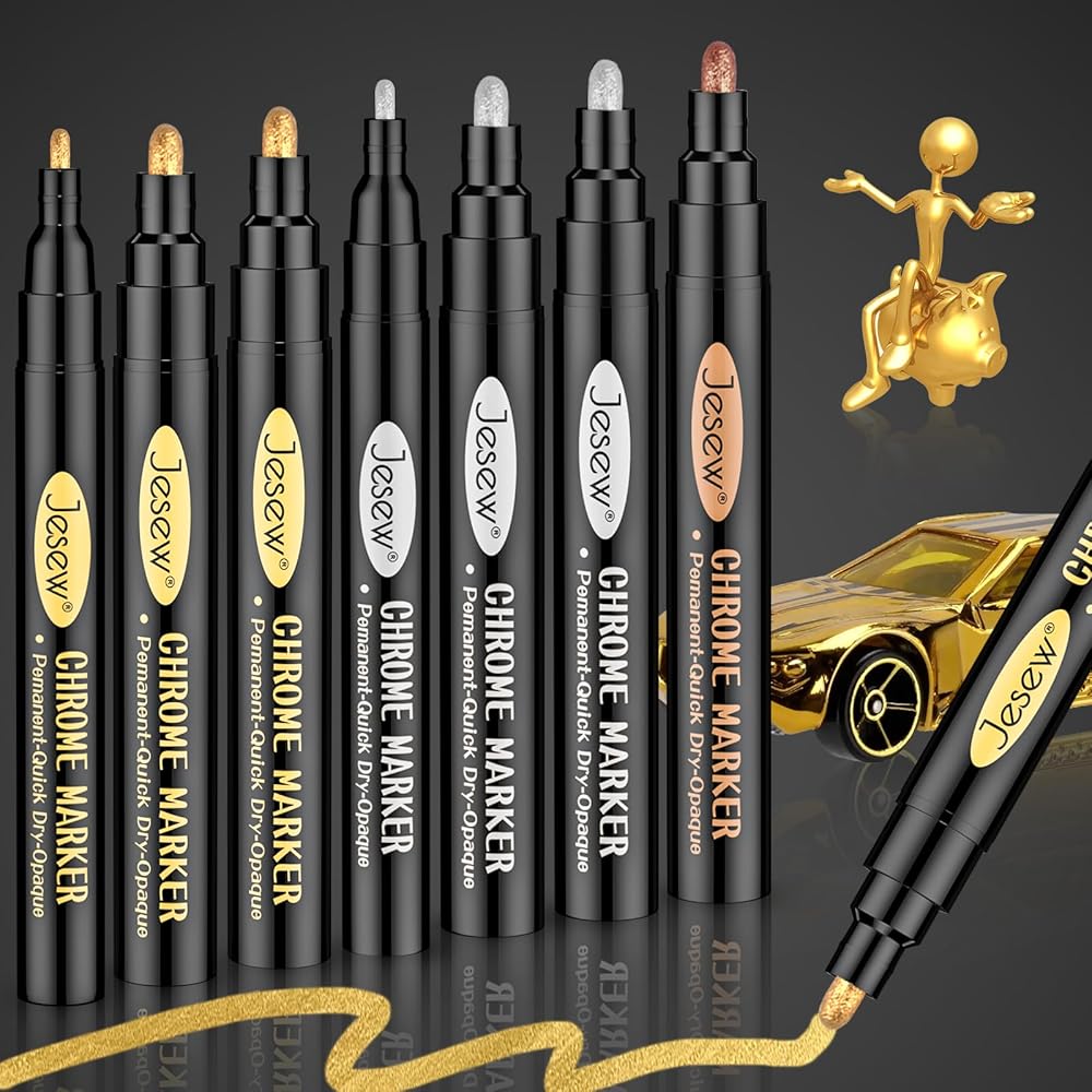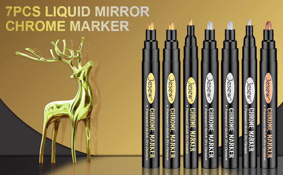 Jesew 7 قطع من أقلام طلاء الكروم السائلة ذات المرآة السائلة، أقلام طلاء كروم عاكسة دائمة باللون الفضي والذهبي والوردي للإصلاح، أو طلاء النماذج، أو وضع العلامات أو المشاريع الفنية DIY، علامات معدنية شديدة اللمعان مقاومة للماء