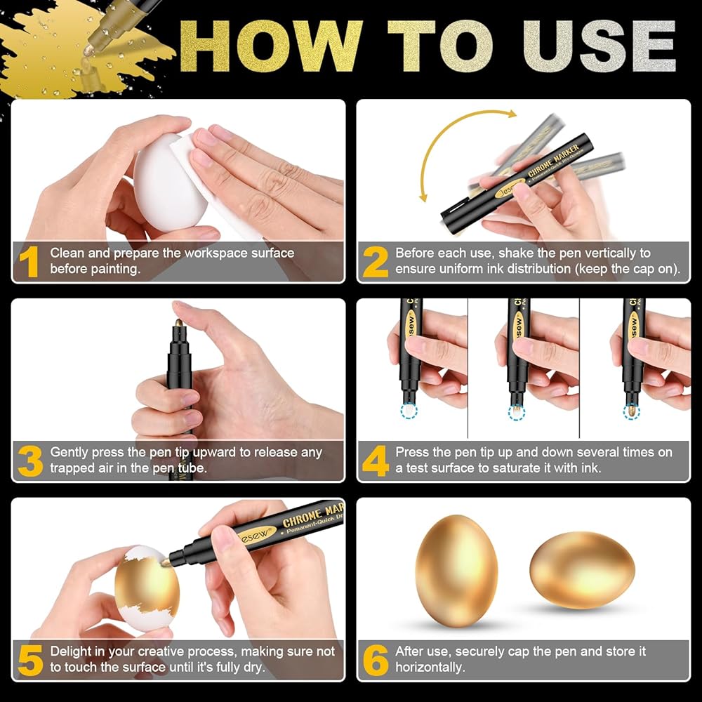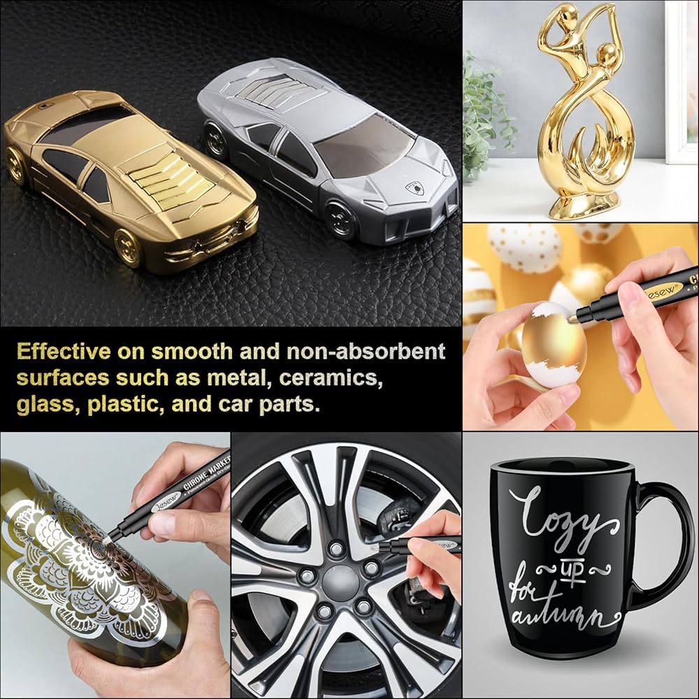 استخدام متعدد الاستخدامات: استكشف مجموعة واسعة من الإمكانيات مع أقلام طلاء الكروم العاكسة عالية اللمعان. إنها تلتصق بشكل لا تشوبه شائبة بالبلاستيك والزجاج والمعادن والطين والقماش والمزيد. مثالية للحرف اليدوية والديكورات وإضفاء الطابع الشخصي على العناصر مثل حافظات الهاتف والنظارات والسيراميك.