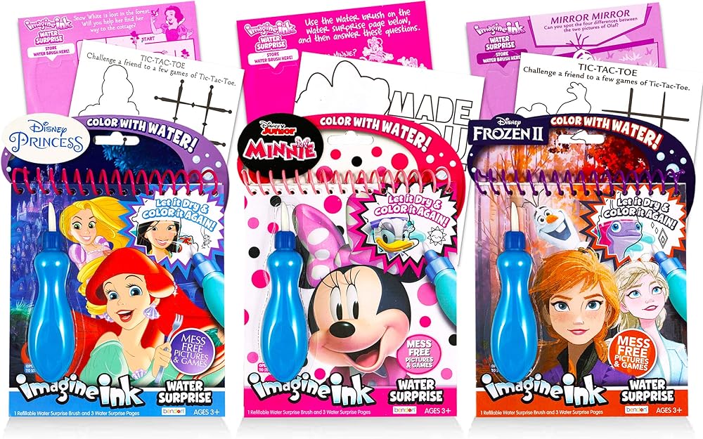 يرسم الأطفال ويلونون شخصيات ديزني المفضلة لديهم باستخدام الماء فقط! توفر ساعات من مرح الرسم بدون فوضى.