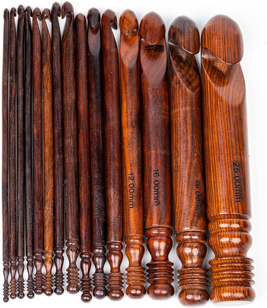 خطافات كروشيه فاخرة مصنوعة يدويًا بمقابض النجارة | مجموعة خطافات كروشيه 15 قطعة | خطاف كروشيه من خشب الورد | inanosa