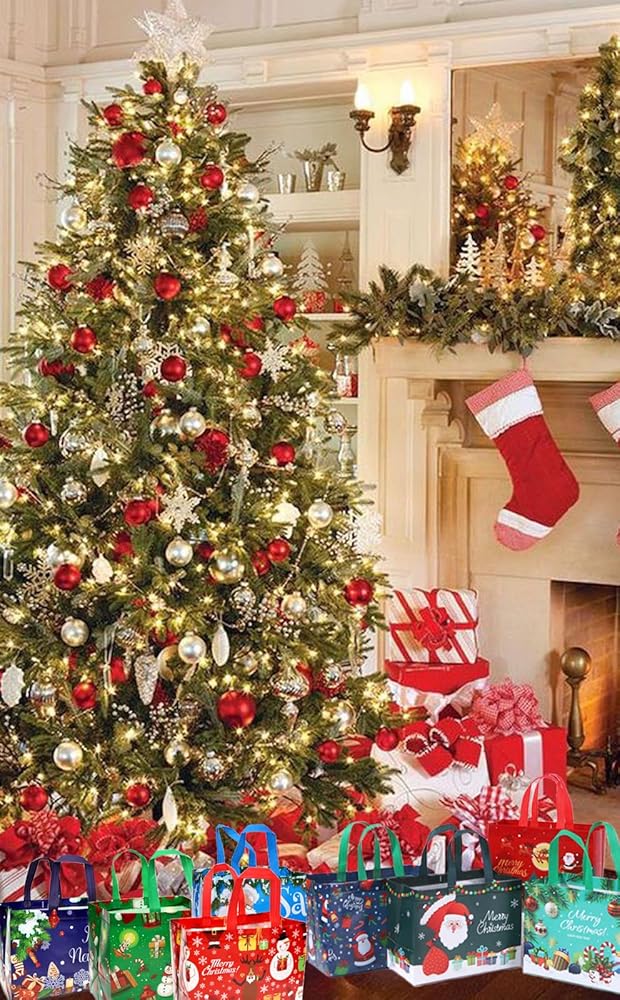 تصميم الكريسماس - حقائب الكريسماس بمقابض متينة، مريحة وسهلة الحمل، مثالية للتسوق والسفر والتخزين. تحتوي حقائب هدايا حفلات الكريسماس على 8 تصميمات للكريسماس، والعديد من أنماط عناصر الكريسماس الكلاسيكية واللطيفة.
