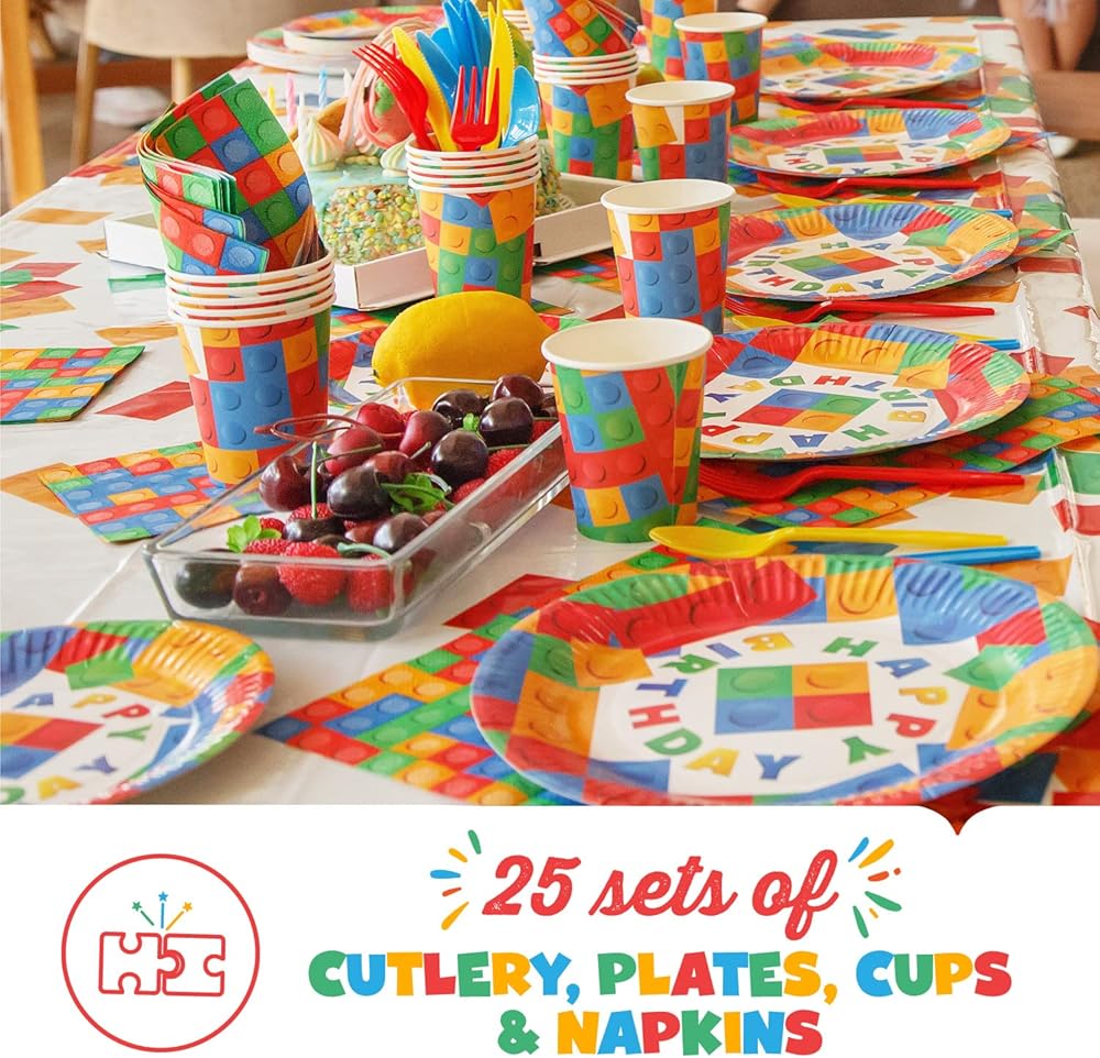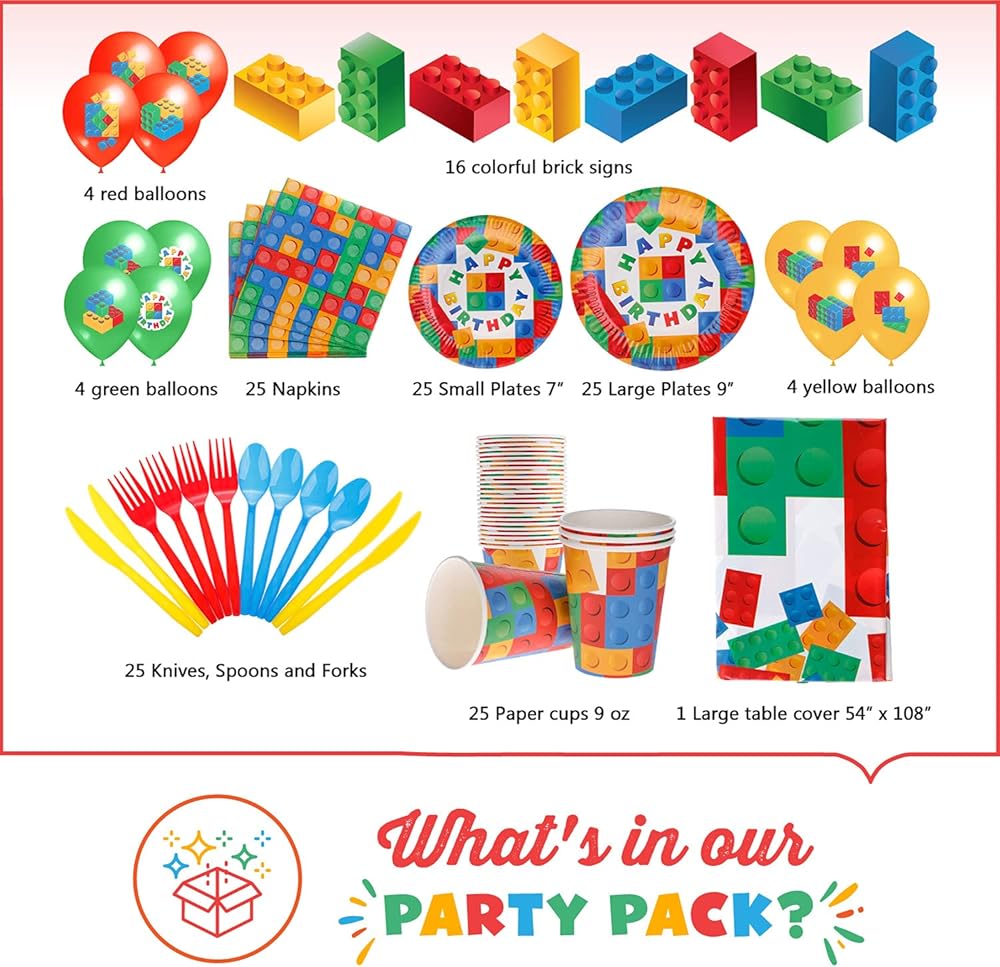 ️ ️ وفر الوقت والمال - لا حاجة لكسر المال أثناء استضافة حفلة عيد ميلاد مذهلة. تتضمن مجموعة حفلات الطوب الخاصة بنا جميع عناصر الحفلات الأساسية، مما يوفر لك الوقت والمال أثناء التسوق في لوازم أعياد الميلاد. تحتوي المجموعة على: 25 طبق عشاء وحلوى وأكواب وشوك وملاعق وسكاكين ومناديل، 1 مفرش طاولة (54 × 104 انش)، 12 لافتة حائط وبالونات. تأتي جميع المكونات ملفوفة بعناية وتستغرق بضع دقائق فقط للتركيب، مما يترك لك شيئًا واحدًا تفعله - استمتع بحفلة مزينة بشكل مثالي!