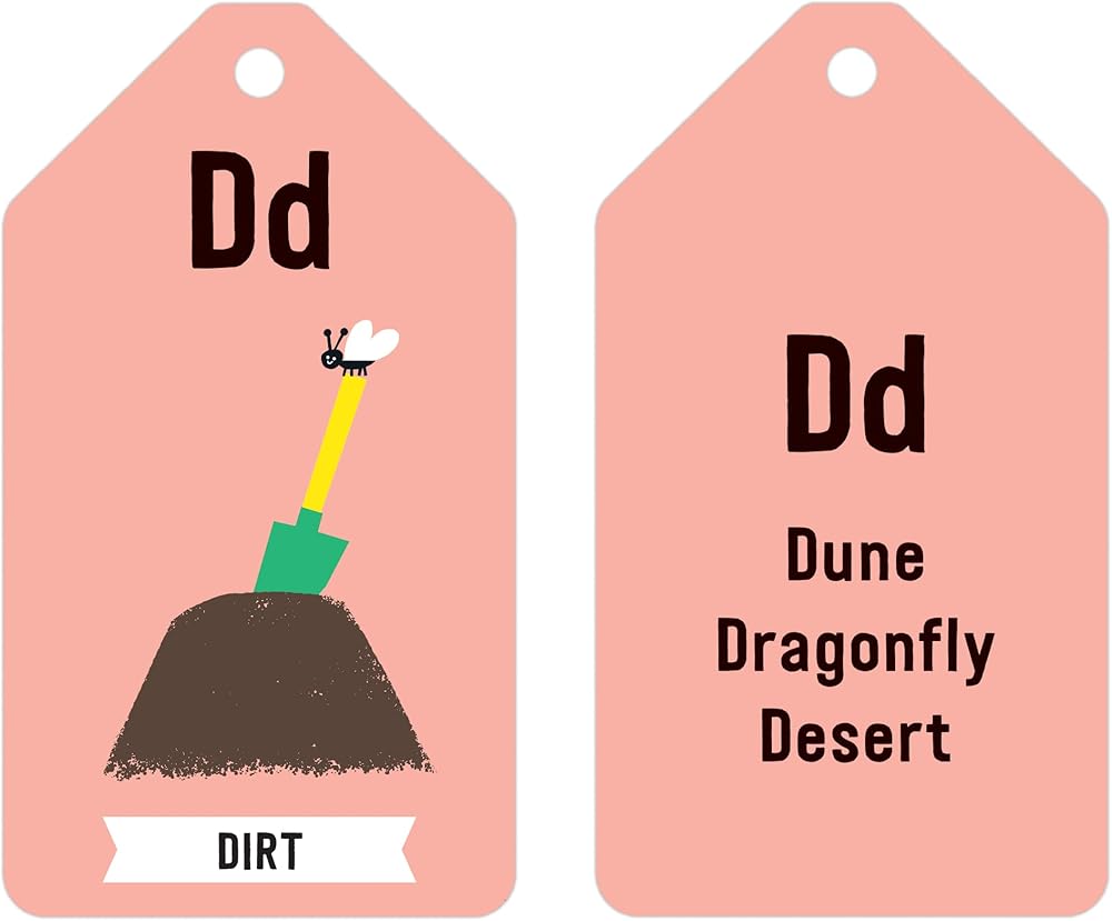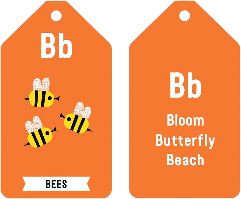 عمل فني غريب الأطوار: ابتكرت الفنانة ناتالي مارشال رسومًا توضيحية ممتعة على كل بطاقة من بطاقات ABC الـ 26 مما يسمح للأطفال بربط الكلمات الإسبانية بأحرف الأبجدية. الجزء الخلفي من البطاقة يعرض الحروف الكبيرة.