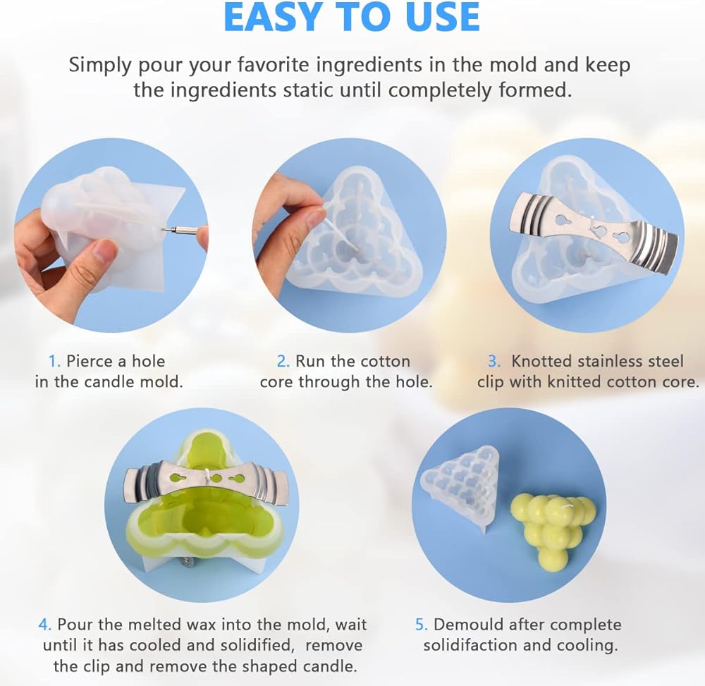 【سهلة الاستخدام】ثبت فتيل الشمعة في وسط قالب الشمعة، ثم اسكب سائل الشمع الساخن مع وعاء ذوبان الشمع، وانتظر حتى يصبح ثابتًا، ثم تحتاج إلى تبريده بالماء البارد ودفع الجزء السفلي من القالب. العفن بخفة لإخراج الشمعة.
