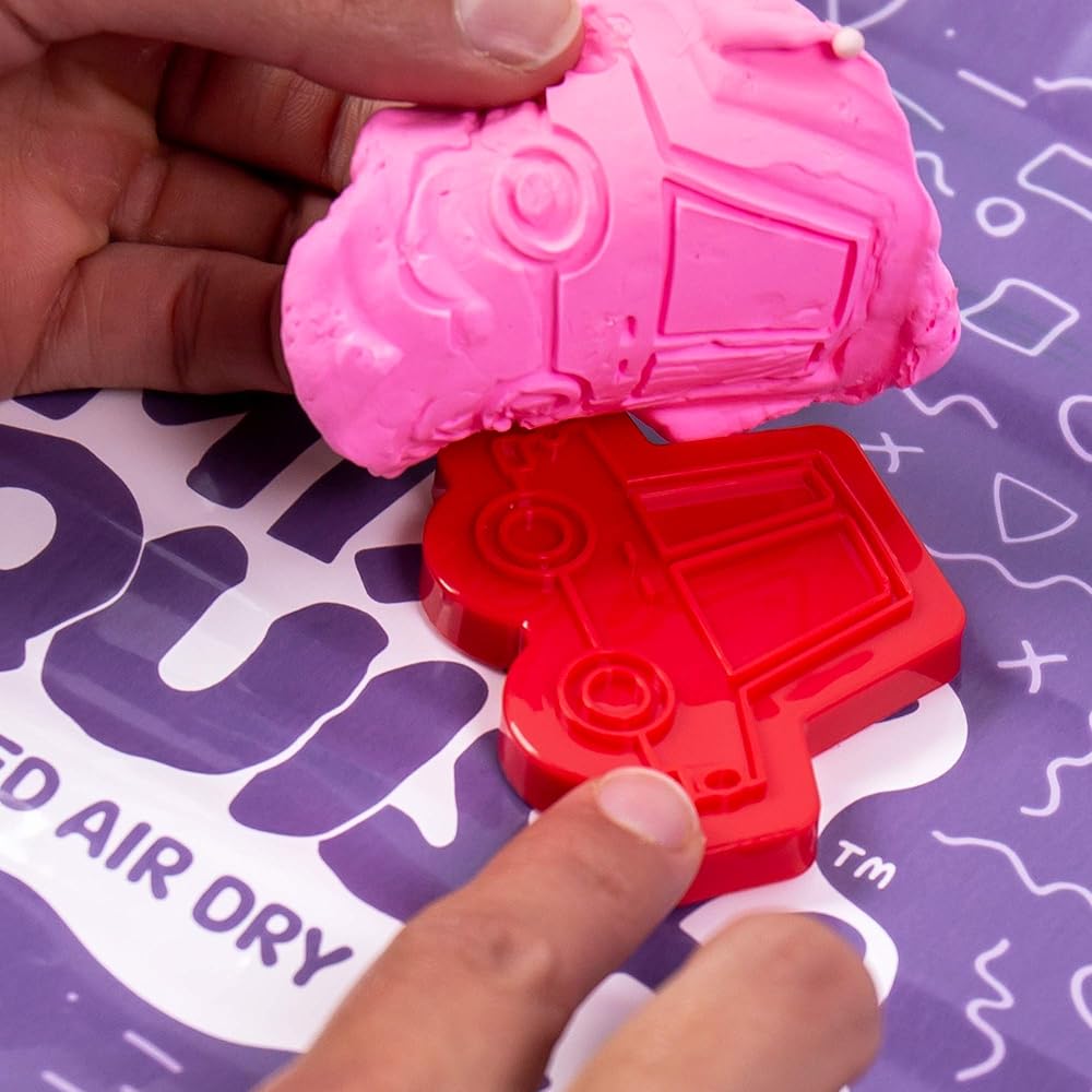 تشتمل المجموعة على: 20 لونًا من أكياس الطين الممزوجة مسبقًا بالهواء الجاف مع كرات إسفنجية ملونة وملمع (1 أونصة لكل قطعة)، 3 قوالب (ديناصور، سيارة، يونيكورن)، 14 أداة نحت، تعليمات سهلة الاتباع