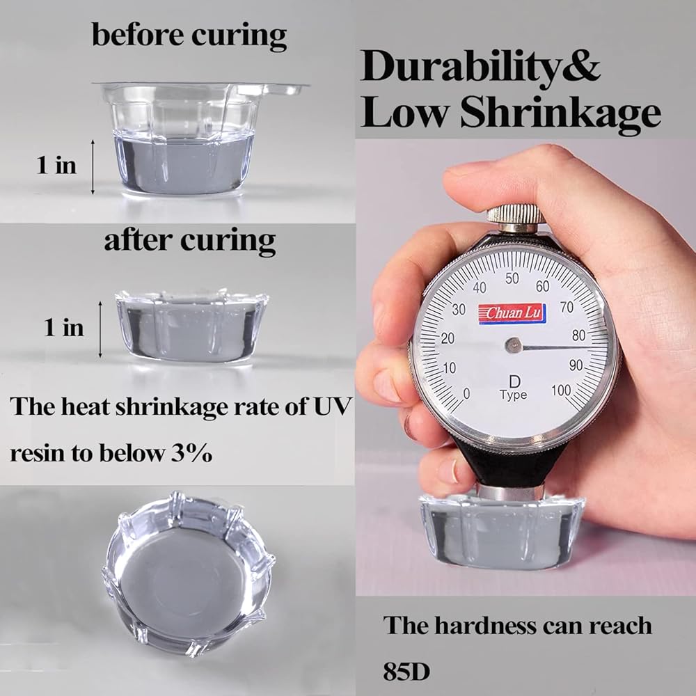 سهل الاستخدام وفعال: لا يوجد خلط مثل راتنج AB الذي يحتاج إلى المزج ويستغرق وقتًا طويلاً للمعالجة، وراتنج الأشعة فوق البنفسجية لا يتطلب أي تحضير وجاهز للاستخدام ويمكن معالجته بقوة باستخدام مصباح الأشعة فوق البنفسجية. سيختلف وقت المعالجة الكاملة اعتمادًا على العديد من العوامل. مثل السُمك والمواد المضافة وما إلى ذلك. يُعد صب طبقات رقيقة (1/8 بوصة أو نحو ذلك) ومعالجة كل طبقة الطريقة الأكثر فعالية لاستخدام راتينج الأشعة فوق البنفسجية. كلما سكبت سمكًا أكثر، زادت المدة التي ستحتاجها تحت المصباح.