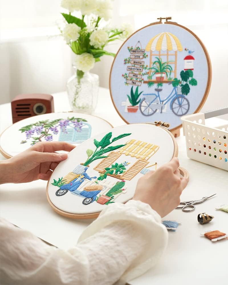 What's in the Box? - The kit includes everything you need, including the hoop x 1, embroidered cloth with pattern x3, needles x 3 and high quality threads x 3, as well as the step-by-step instructions x 3.