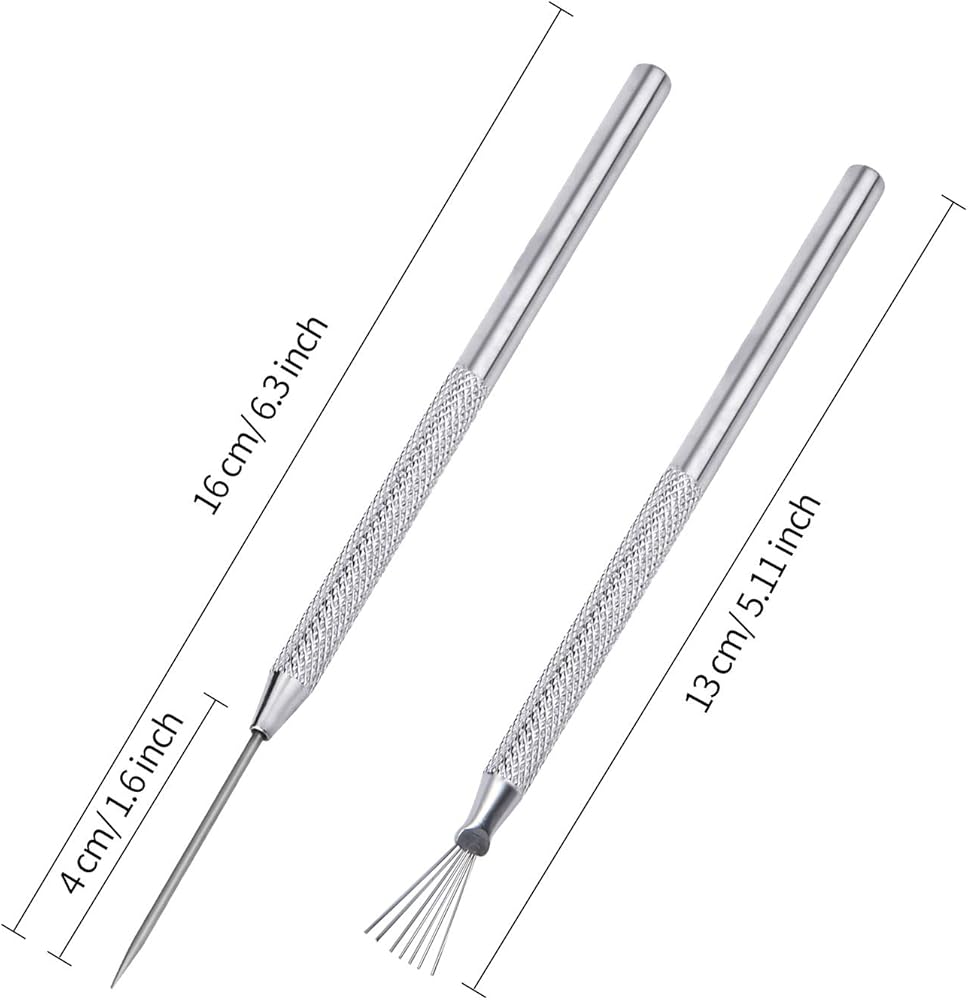 قياس أداة التفصيل بالإبرة 16 سم، الطول الكلي تقريبا، قطر الطرف حوالي 1.5 مم وطول طرف الإبرة المدببة تقريبًا 4 سم.