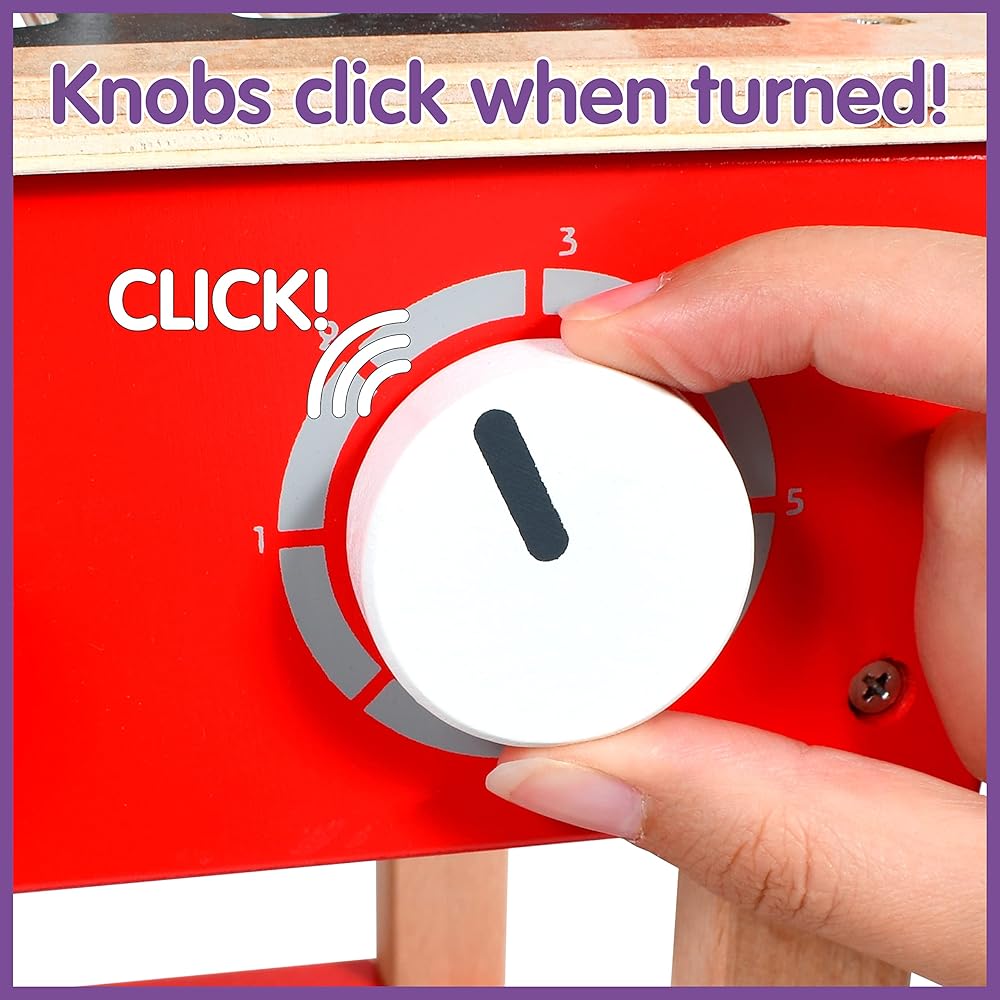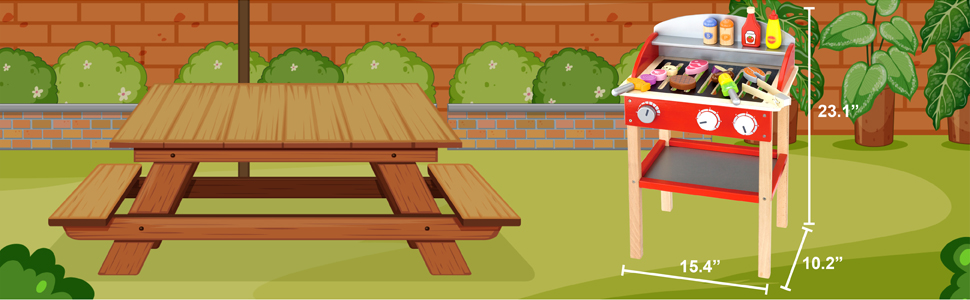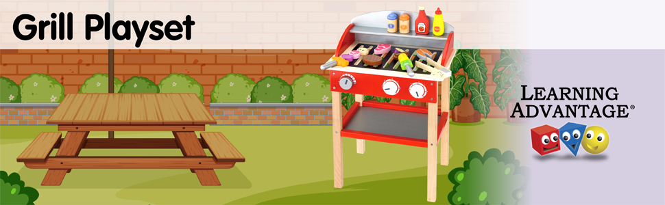 Create a realistic barbecue cookout experience! This grill features food, skewers, tongs, condiments and more! Easily slide small food onto wooden skewers. Lift larger food with the tongs. Turn the wooden knobs and listen to them click. Give children the experience of creating savory barbecue treats. This set is perfect for parent-child interaction and role-play.