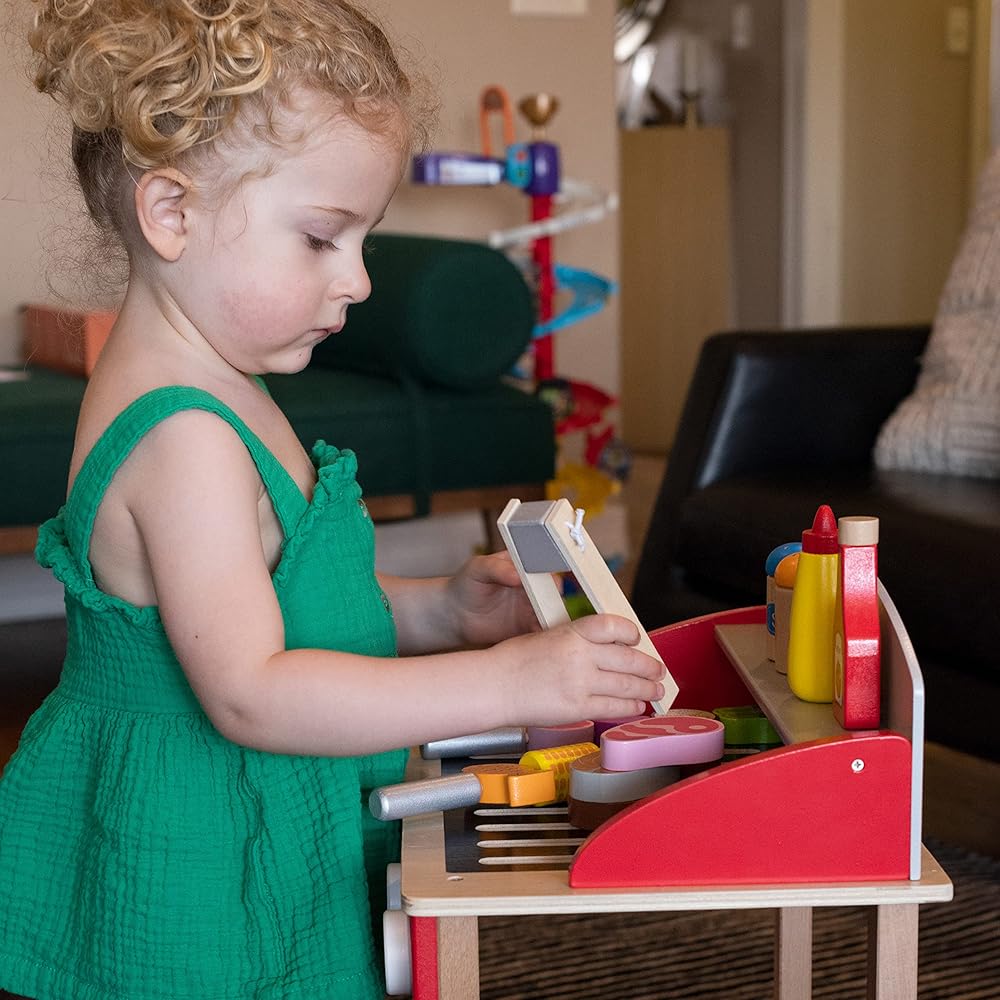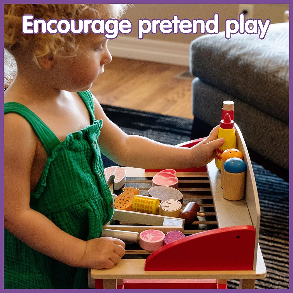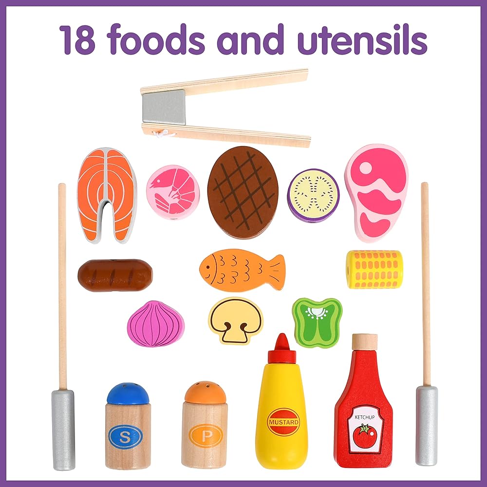 مجموعة لعب SPARK & WOW Grill - لعبة طبخ خشبية للأطفال - 18 نوعًا من الأطعمة والأواني المختلفة - تلهم اللعب التظاهري والخيال بالشواء