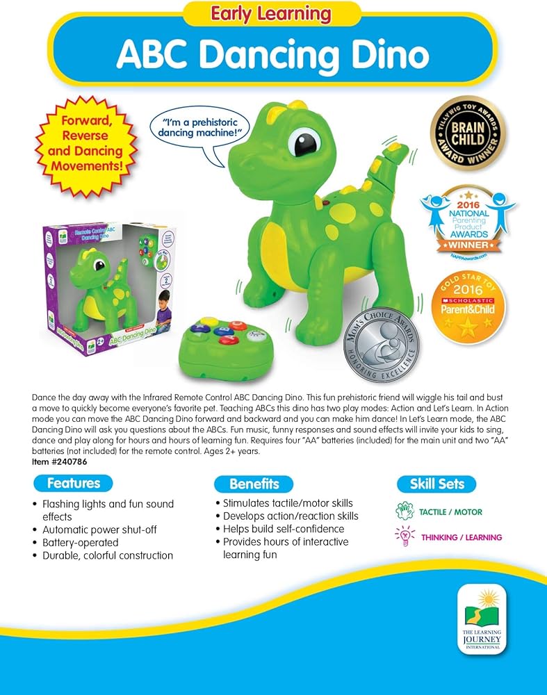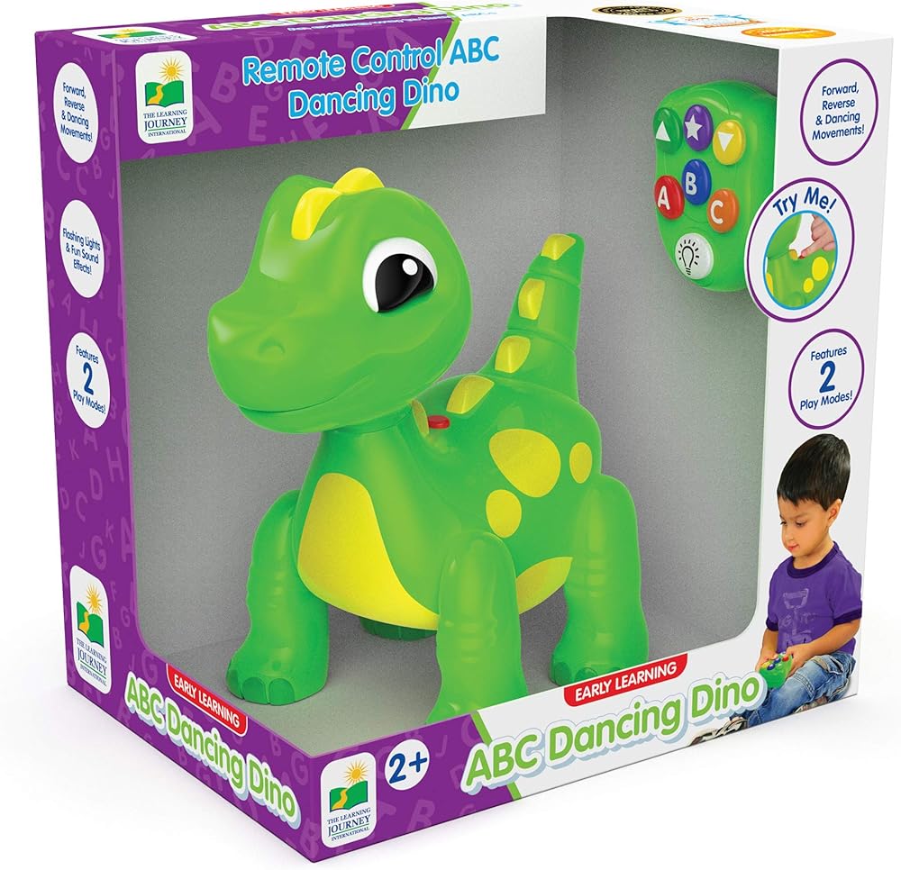 ارقص لتنسى هموم يومك مع الديناصور الراقص من ايه بي سي المزود بجاهز تحكم عن بعد الديناصور الراقص يلوح بذيله ويتحرك راقصًا ليصبح بسرعة الحيوان المفضل لدى الجميع له نمطان للعب: الحركة ودعنا نتعلم في نمط الحركة يمكنك تحريك الديناصور الراقص للأمام والخلف وجعله يرقص في نمط دعنا نتعلم سيسألك دينو أسئلة حول ايه بي سي وحول الألوان موسيقى مسلية واستجابة مضحكة ومؤثرات صوتية لتشجع طفلك على الغناء والرقص واللعب مع الديناصور يتطلب 3 بطاريات ايه ايه مناسب لعمر سنتين وما فوق