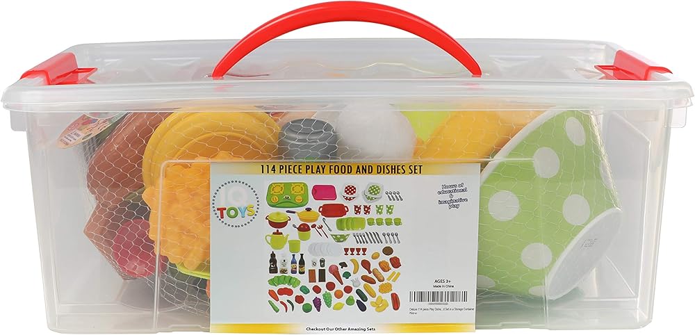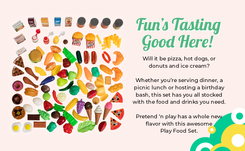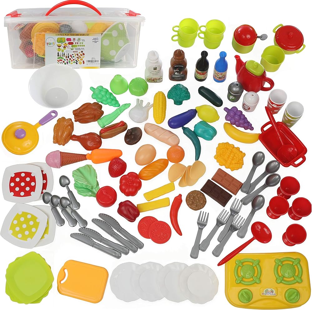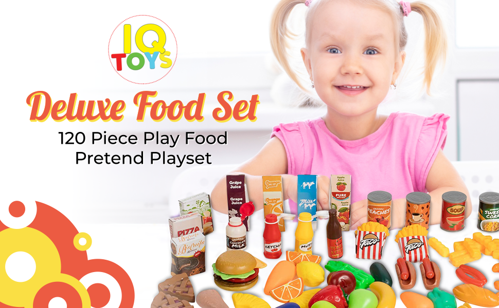120 قطعة: تتضمن مجموعة لعب الطعام هذه جميع مستلزمات المؤن والثلاجة من الصلصات والحساء والعصائر إلى الفواكه والخضروات وشرائح البيتزا والآيس كريم! إنها المجموعة النهائية من طعام اللعب للأطفال الصغار. يحتوي على جميع المجموعات الغذائية الأربع!