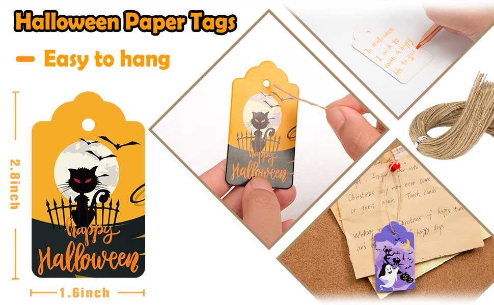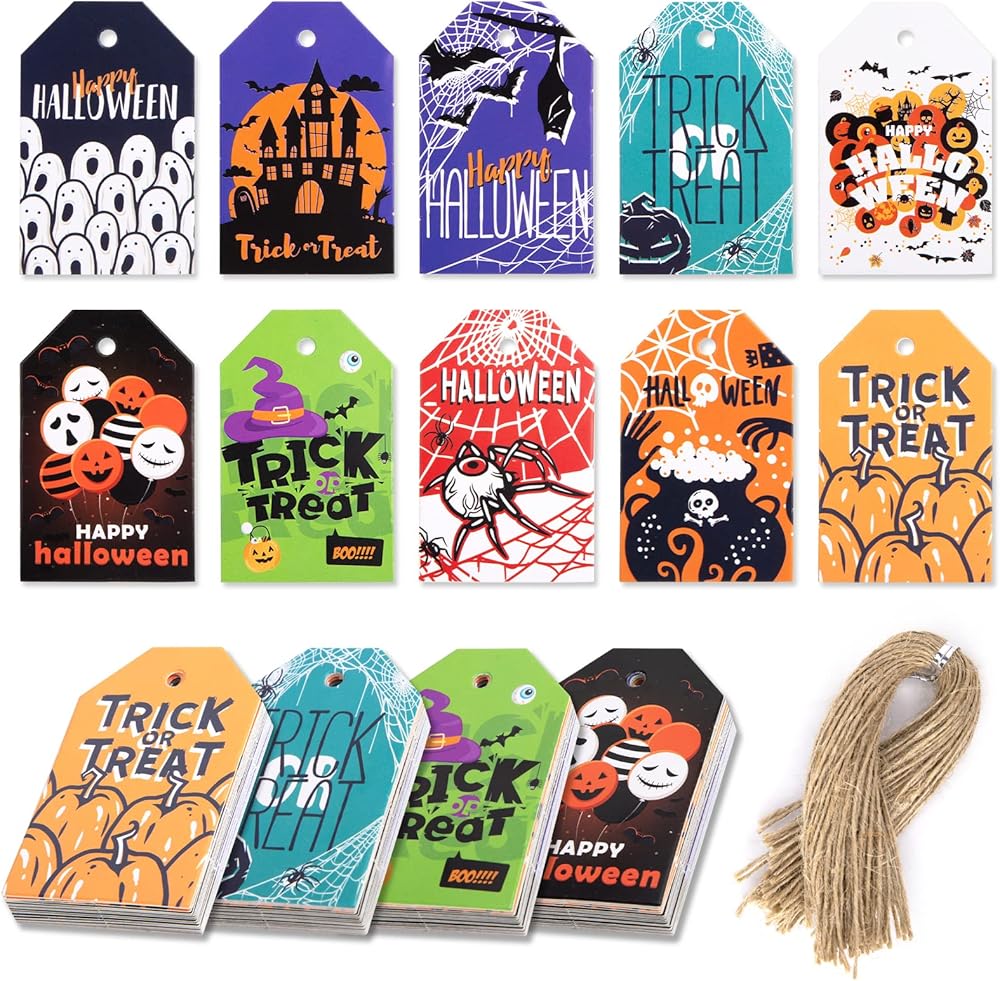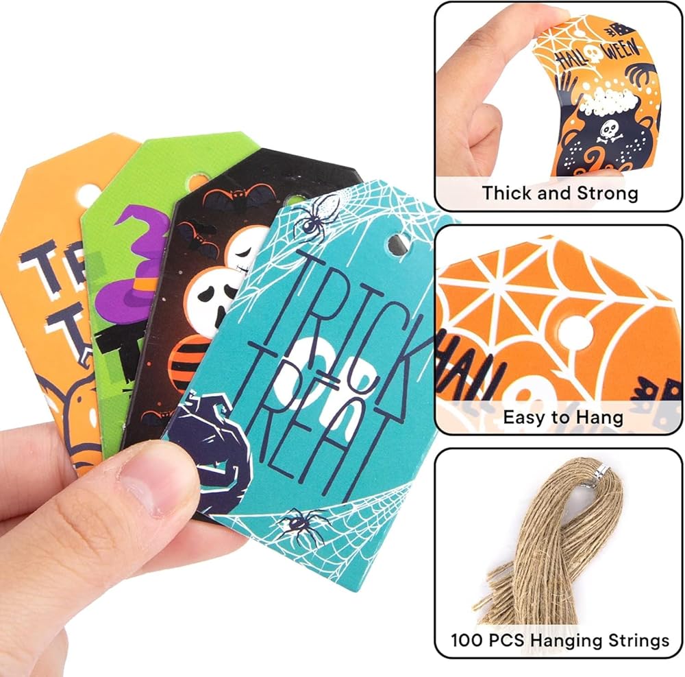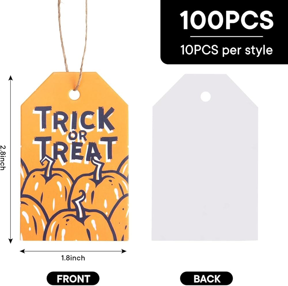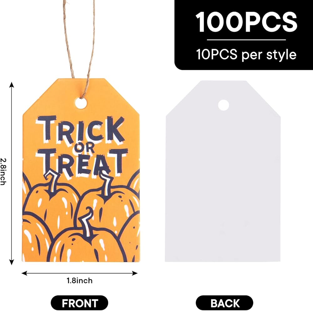 Koogel 100pcs علامات عيد الهالوين ، 1.8x2.8 بوصة هدايا هدايا هدايا مع سلاسل لأكياس Goodie ، حقيبة حلوى الحفلات معلقة