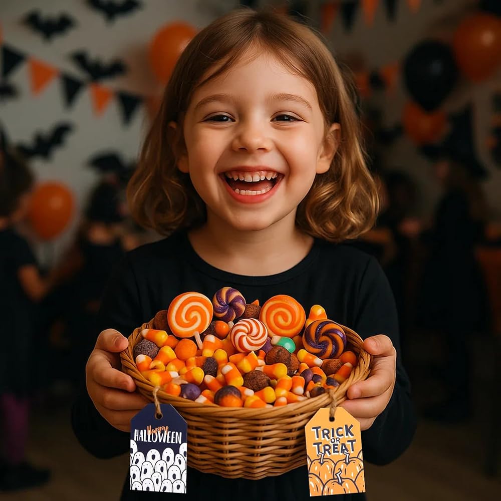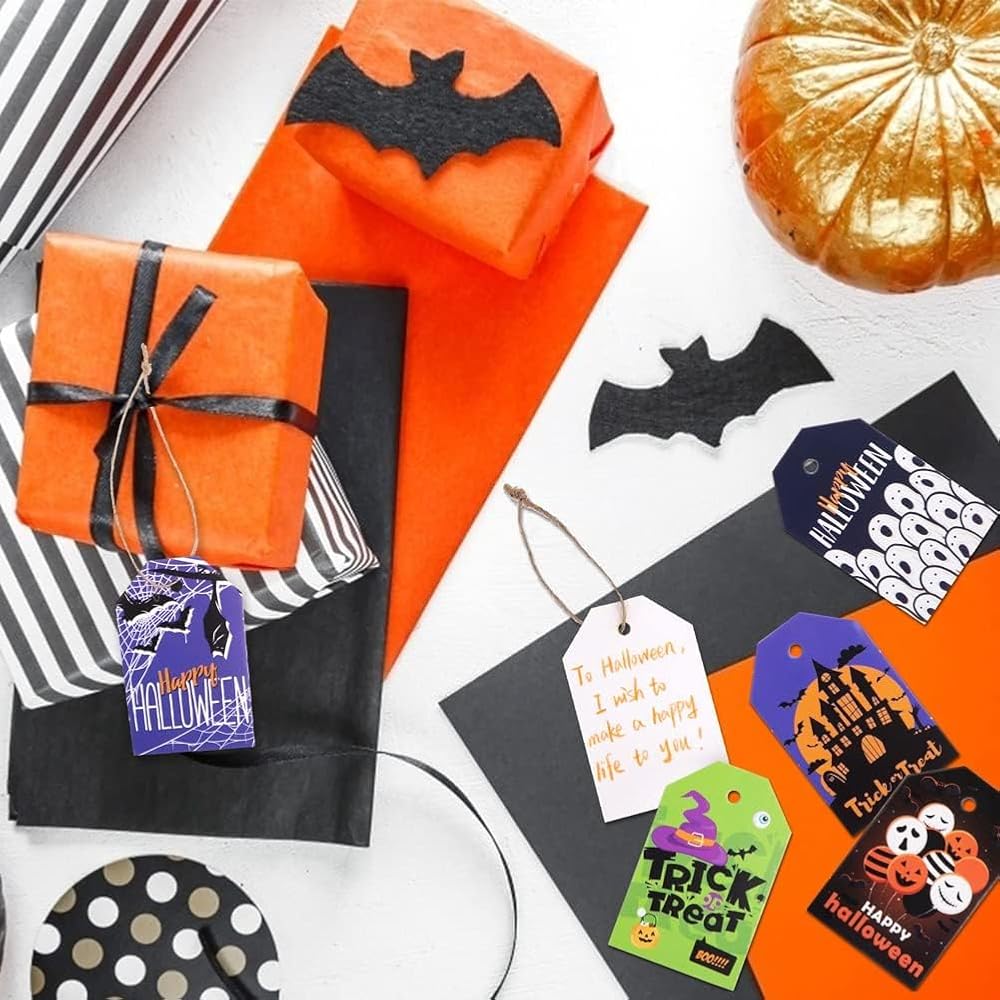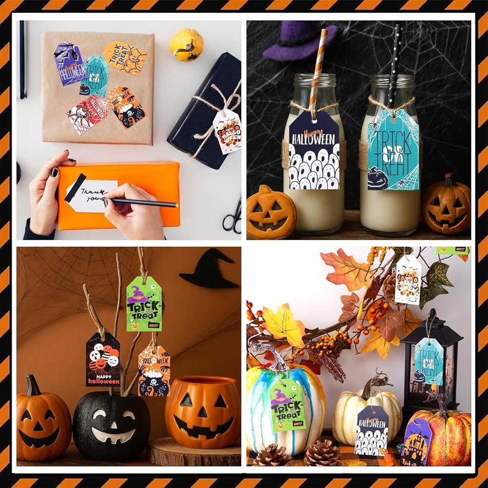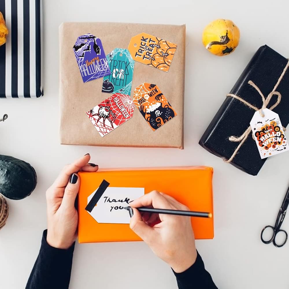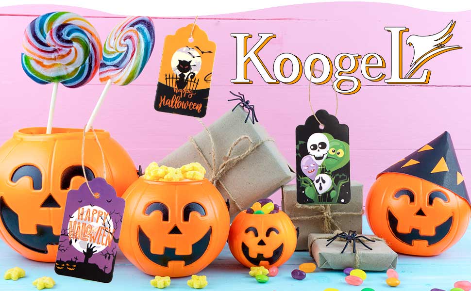 Koogel 100pcs علامات عيد الهالوين ، 1.8x2.8 بوصة هدايا هدايا هدايا مع سلاسل لأكياس Goodie ، حقيبة حلوى الحفلات معلقة