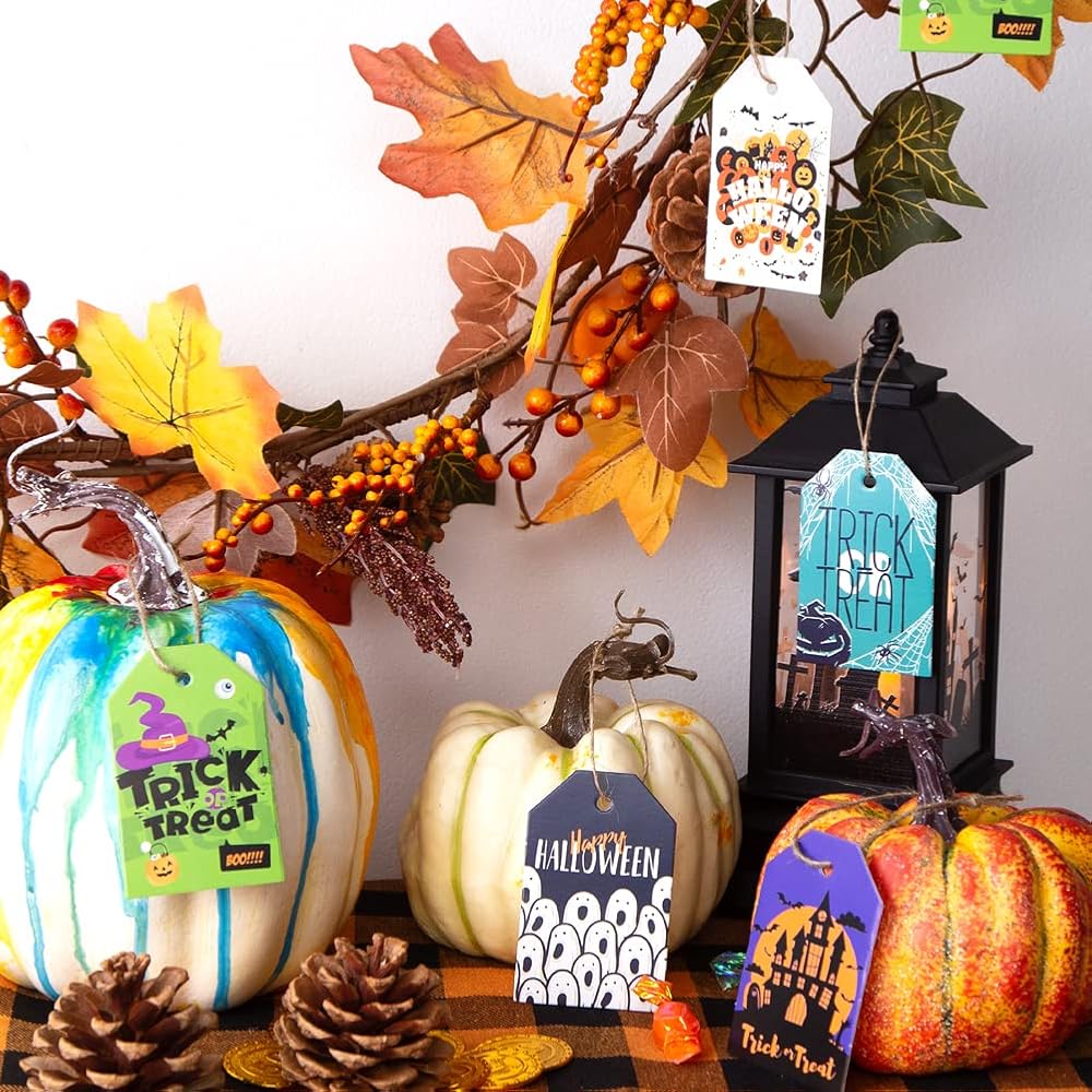 • عبوة قيمة للغاية - تتضمن 120 قطعة من بطاقات الهالوين، 8 أنماط مختلفة لموضوع الهالوين، 15 قطعة لكل نمط (كل بطاقة يبلغ مقاسها حوالي 2.8 × 1.6 بوصة). لذلك سيكون لديك الكثير من الخيارات لتزيين المناسبات المختلفة. سلاسل معلقة مرفقة.