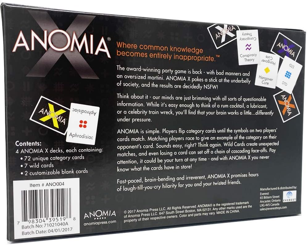 لعبة بطاقات رائعة | متعة غير مناسبة: يبلغ حجم الصندوق 9 انش × 6 انش × 3 انش ويتضمن أربعة (4) بطاقات انوميا X فريدة، تحتوي كل منها على 72 بطاقة فئة مختلفة، 7 بطاقات وايلد و2 بطاقة فارغة قابلة للتخصيص. تستغرق اللعبة النموذجية حوالي 30 دقيقة لـ 3-6 لاعبين، من سن 17 سنة فما فوق. تتوفر مجموعة متنوعة من اللاعبين في القواعد.