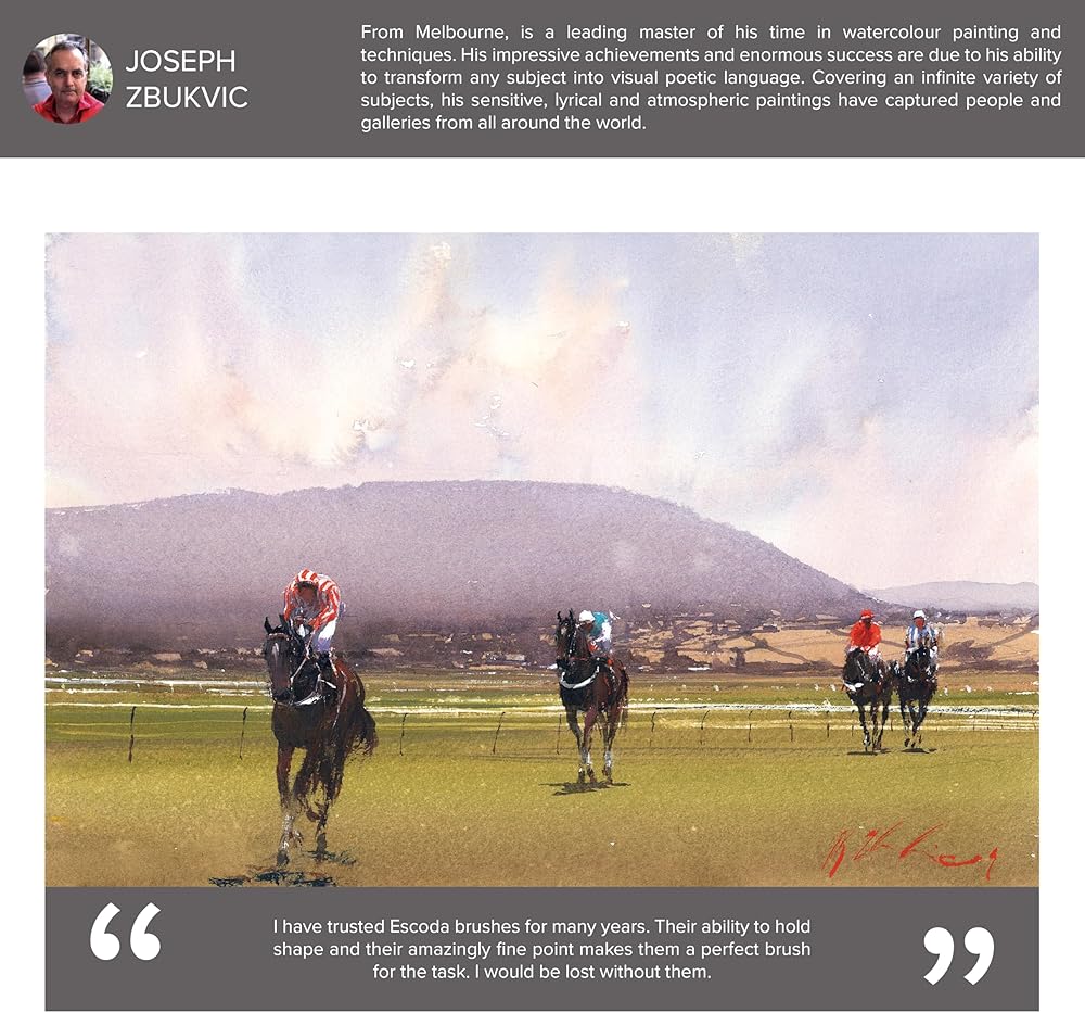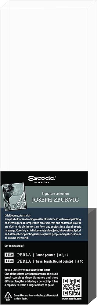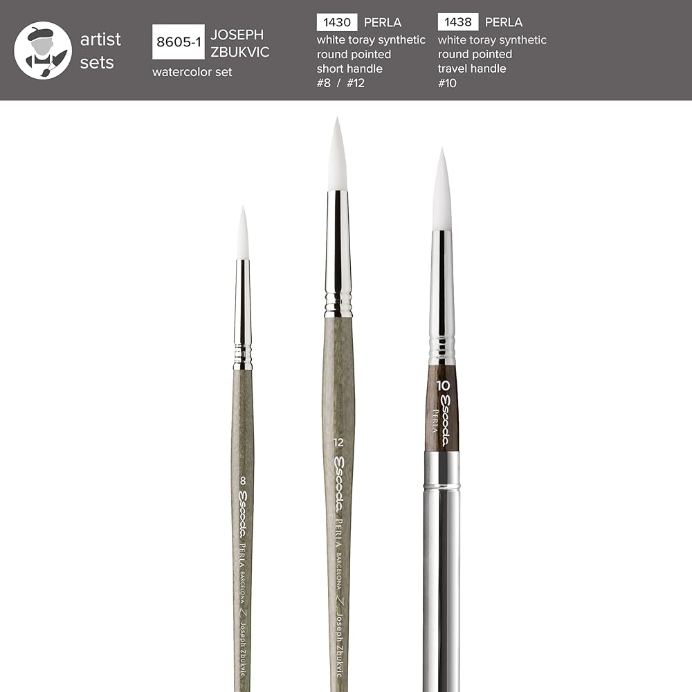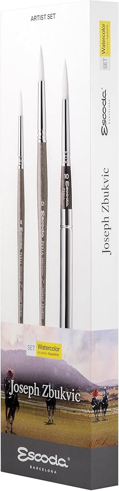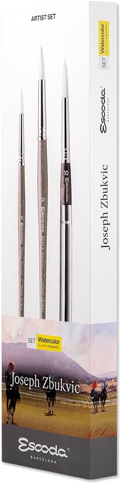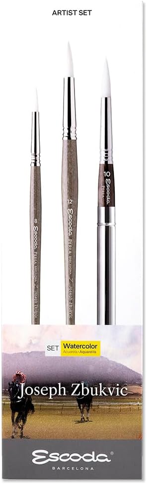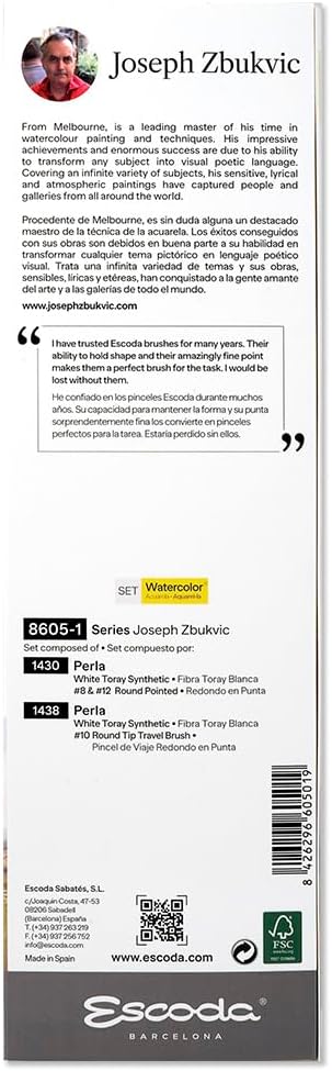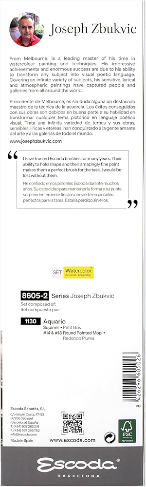 تتضمن مجموعة فرش الألوان المائية ألفارو كاستاجنيت من إسكودا فرشاة برادو ذات مقبض طويل ومدببة من إسكودا رقم 8 ورقم 10 ورقم 12. يتكون برادو من شعر السمور الاصطناعي المروض الذي يشبه إلى حد كبير شعر السمور الكولينسكي. إنها أجود أنواع السمور الصناعي. إنه يقلد لونه ونابضه الطبيعي واستجابة ضربة الفرشاة. ألفارو أستاجنيت هو فنان أوروغواياني ذو شهرة عالمية تم تكريمه في العديد من المسابقات الفنية. وهو مؤلف ناجح يسافر حول العالم لحضور المعارض واستضافة ورش العمل والمشاركة كعضو في لجنة تحكيم الأحداث الفنية العالمية. تصنع Escoda فرش الفنان عالية الجودة منذ عام 1933 وهي مشهورة عالميًا بجودتها وابتكارها في تصنيع فرش الفنون الجميلة.