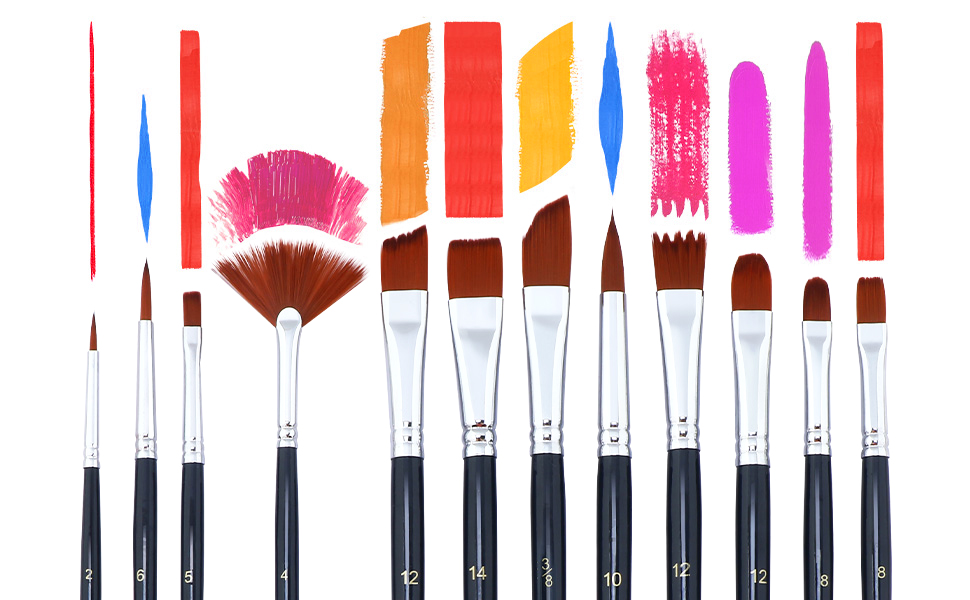 This artist brush set includes 8 different assorted tips: liner, round, flat, angle, filbert, dagger, rake, fan. They are perfectly capable for all kinds of painting techniques.