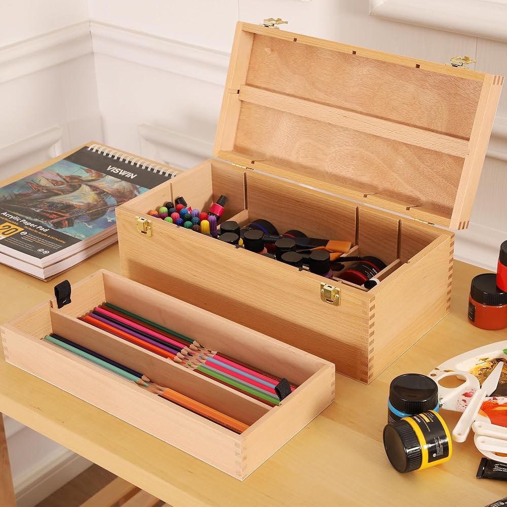 [تخزين مزدوج الطبقات] يتميز صندوق الأدوات الخشبي هذا بتصميم عملي مزدوج الطبقات. يمكن فصل الطبقة العليا دون عناء، مما يوفر وصولاً سريعًا وسهلاً إلى مستلزماتك الفنية. باستخدام حل التخزين متعدد الاستخدامات هذا، يمكنك ترتيب وتخزين مجموعة متنوعة من المواد بشكل فعال، مما يلبي جميع متطلبات التخزين الخاصة بك.